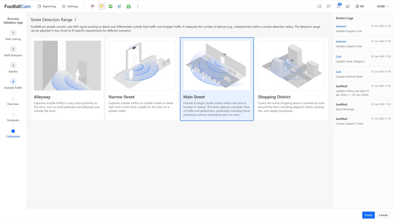 First, determine the store’s physical street environment. Choose the detection range that best matches the store location: