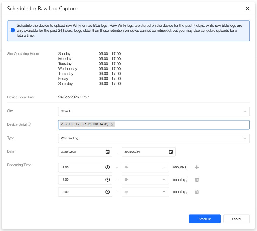 Click “New Schedule” to schedule Wi-Fi or BLE raw log capture for both historical or future date time for calibration.