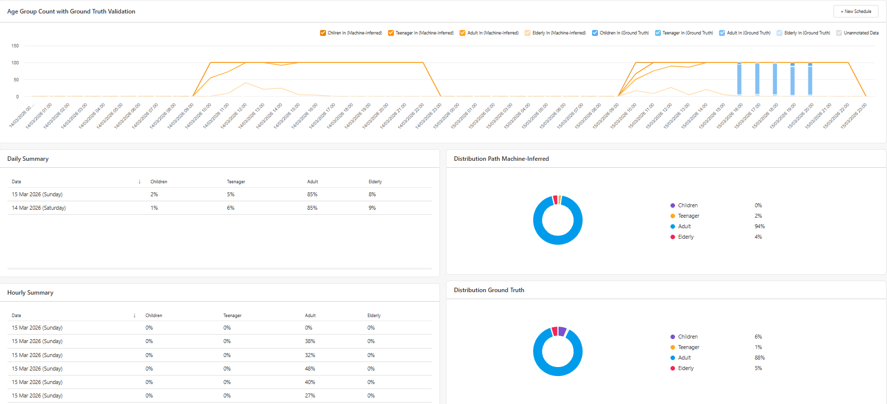 Users can use the Overview Section to obtain an overall high-level summary of the number of each age category being predicted when people enter the store. This page also provides a visual comparison between machine-inferred predictions and ground truth annotations, allowing users to quickly evaluate model performance and identify discrepancies.
