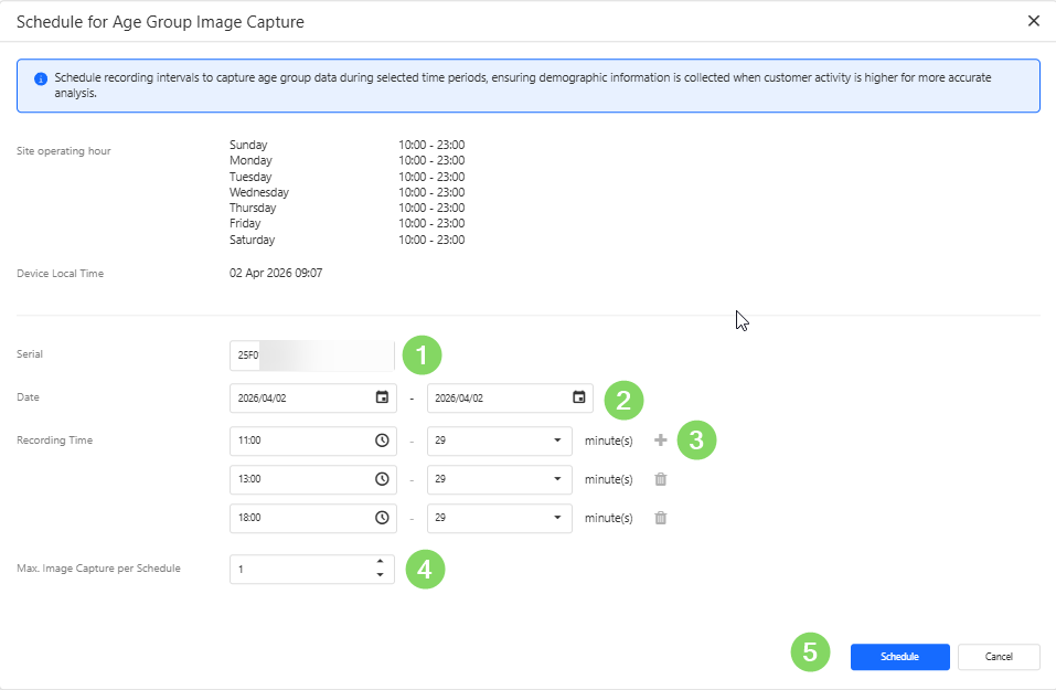 Users can schedule a campaign via the Scheduler Section, where images of each person entering the store at the scheduled hour are captured. To do so, press the "New Schedule" Button.