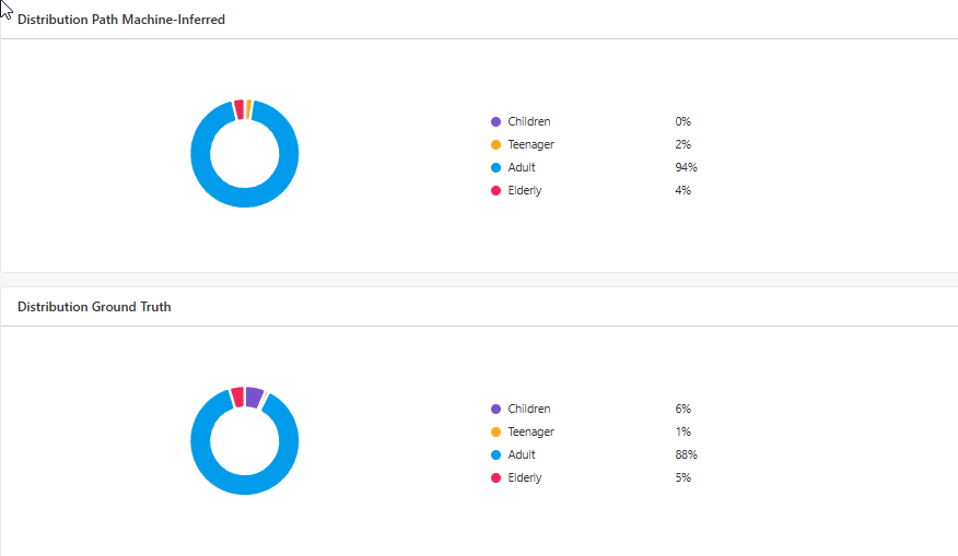 The pie charts provide a quick visual representation of the distribution between each age category based on both machine-inferred predictions and ground truth annotations.
