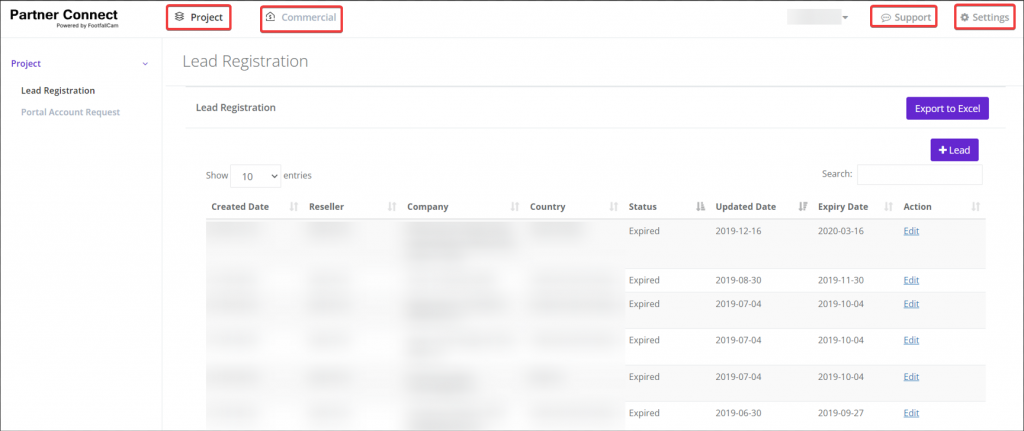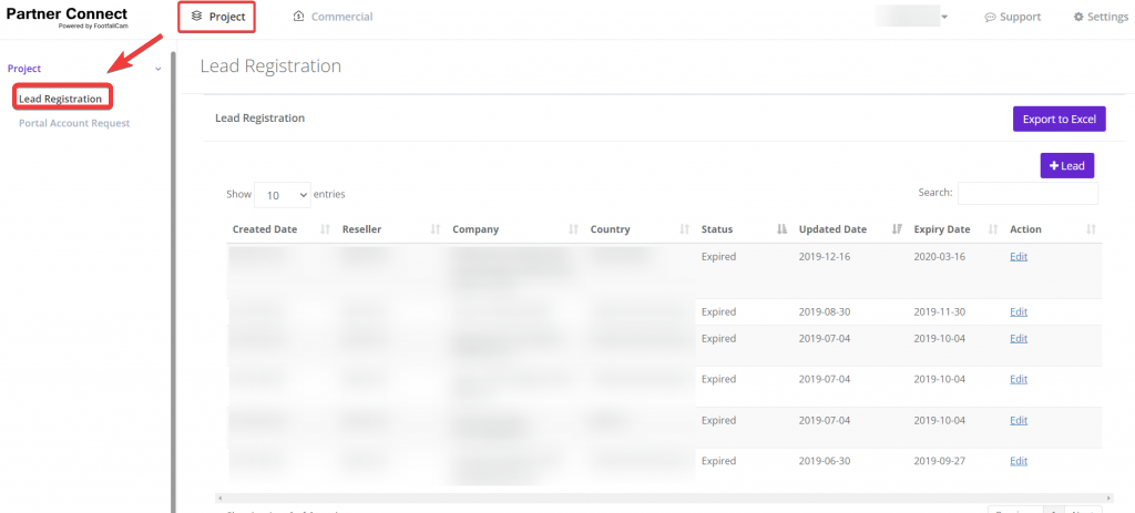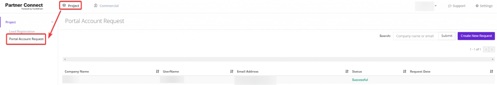 Under the Project section, two options could be discovered: Lead Registration and Portal Account Request.
