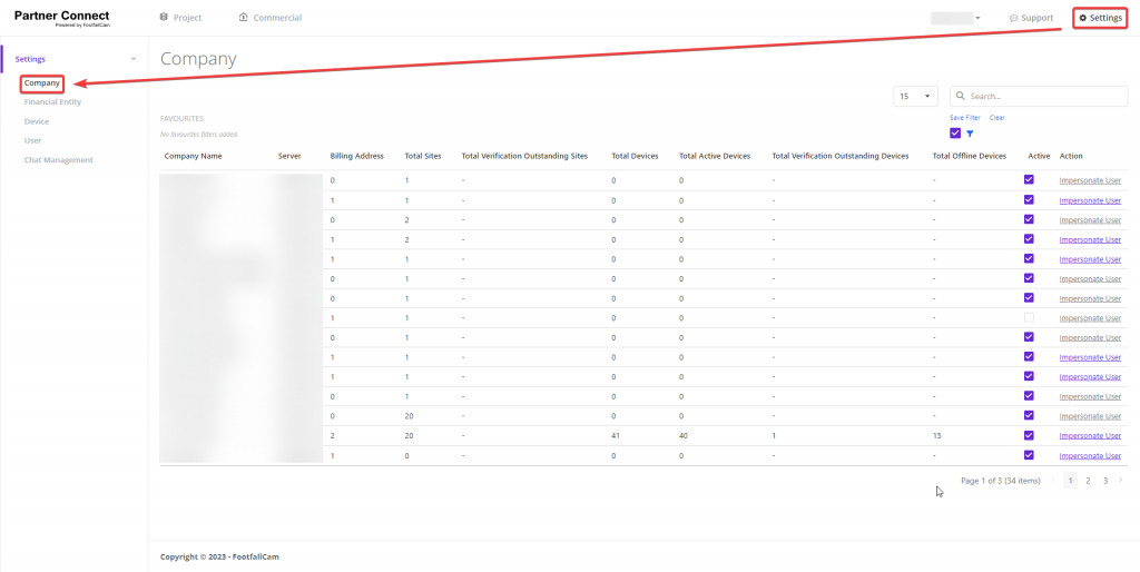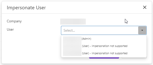 Select the desired company for impersonation, then click on the associated purple link
