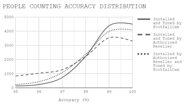 Statistics show that counters that are installed and tuned by FootfallCam has the highest accuracy distribution.