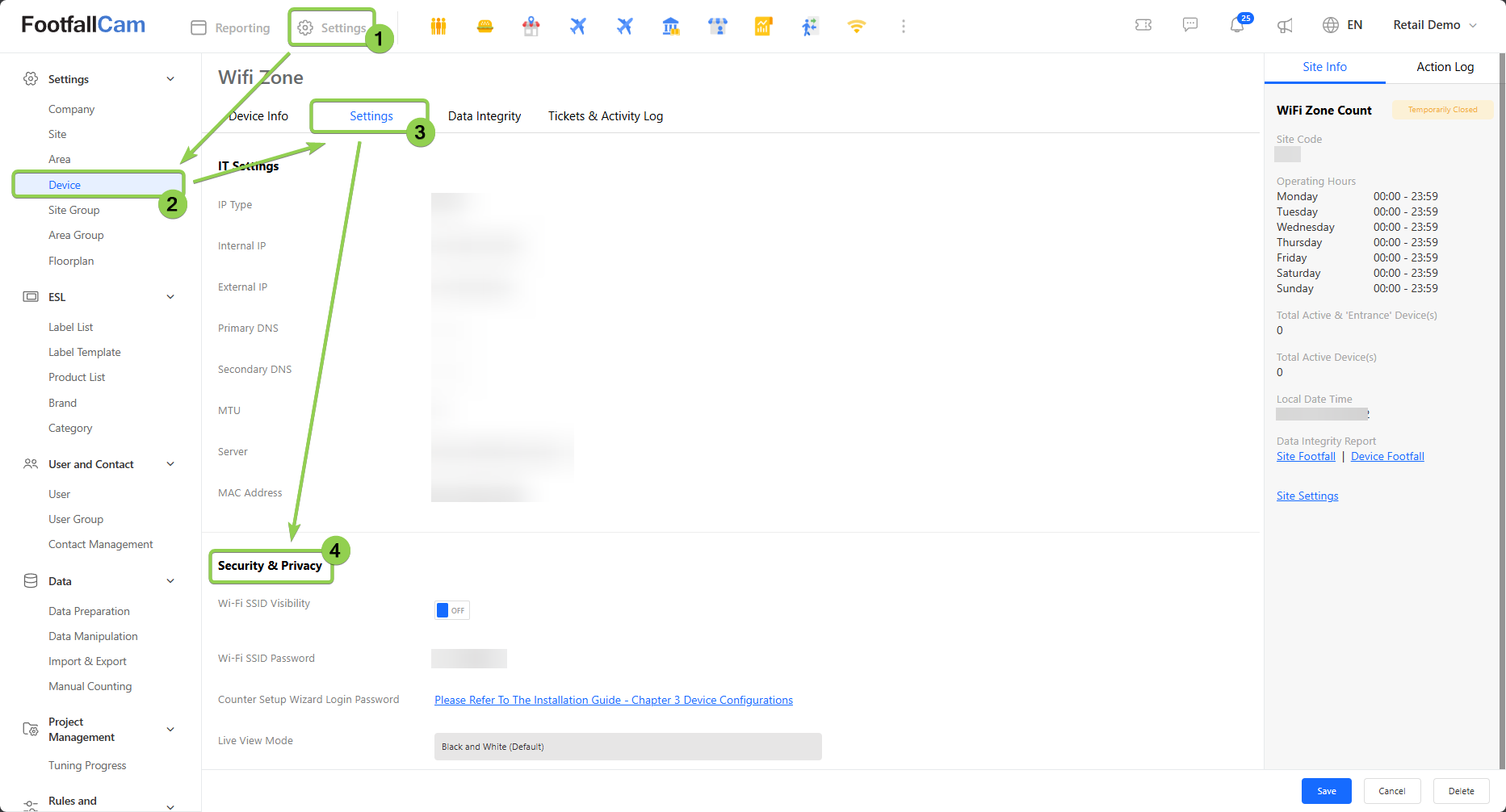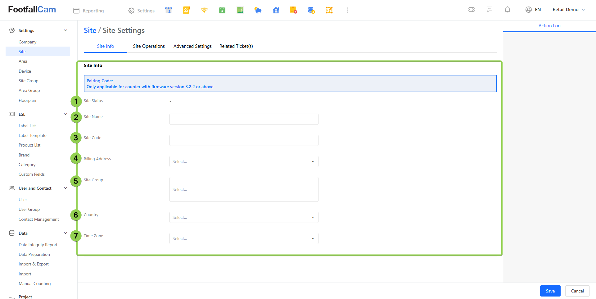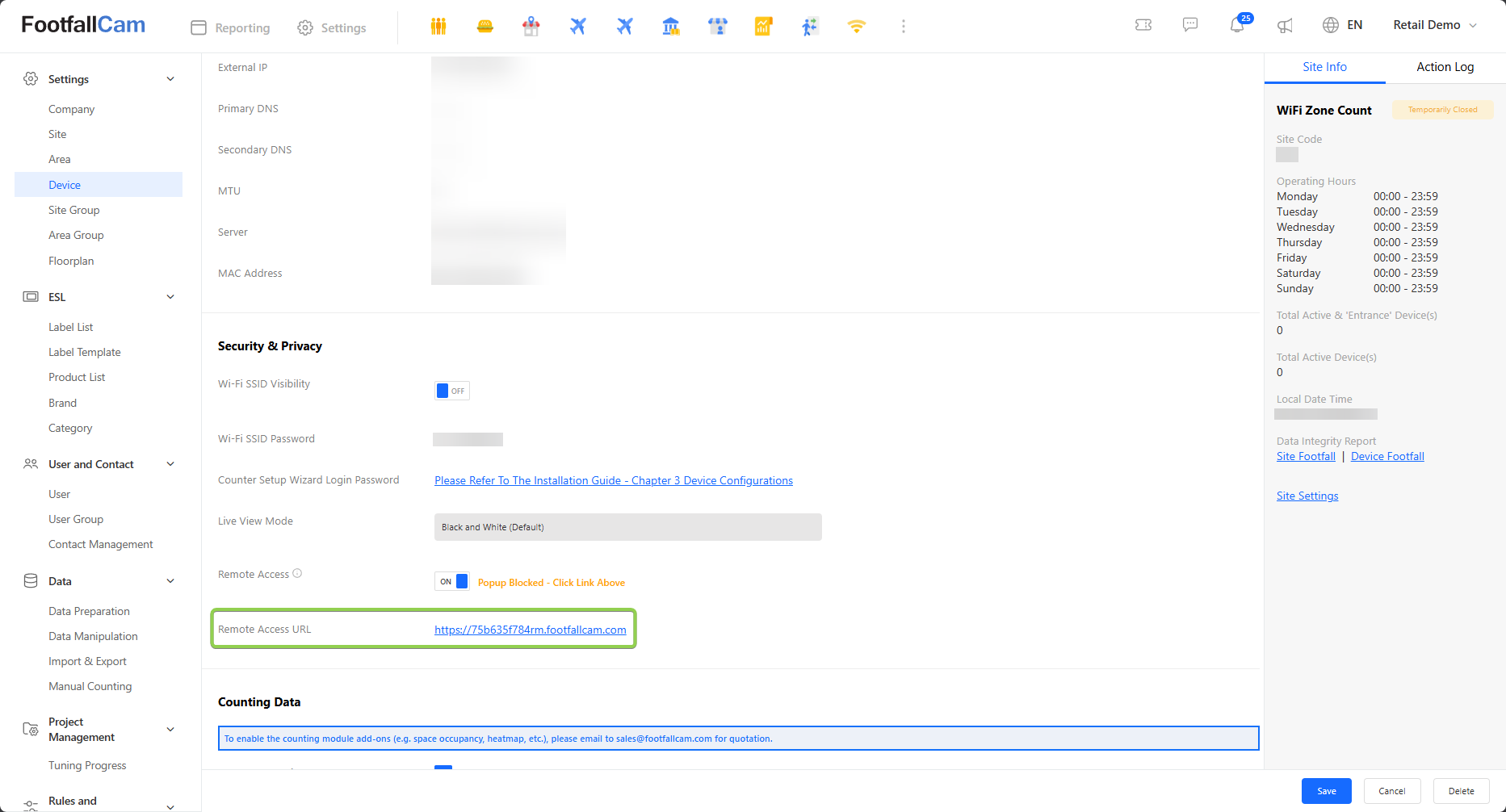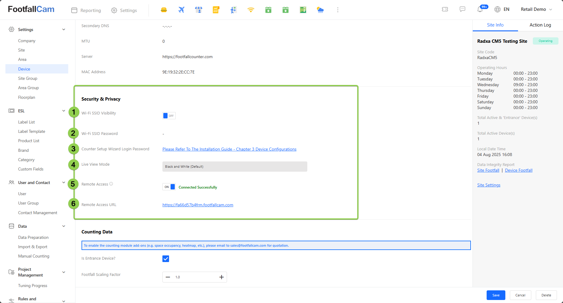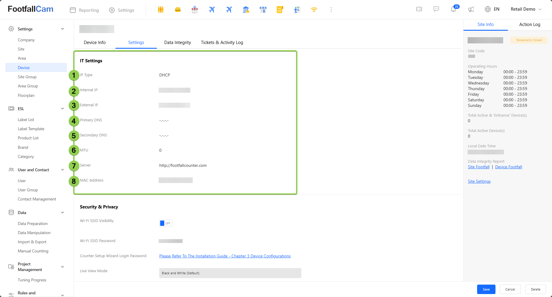 | 2. Site Name | Enter a preferred site name. (Info: Site name inserted will be applied to features in FootfallCam Analytic Manager V9™.) |