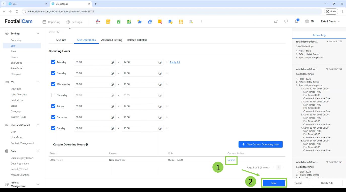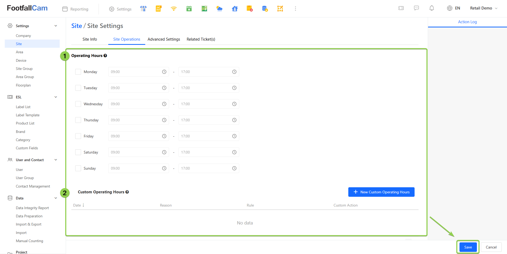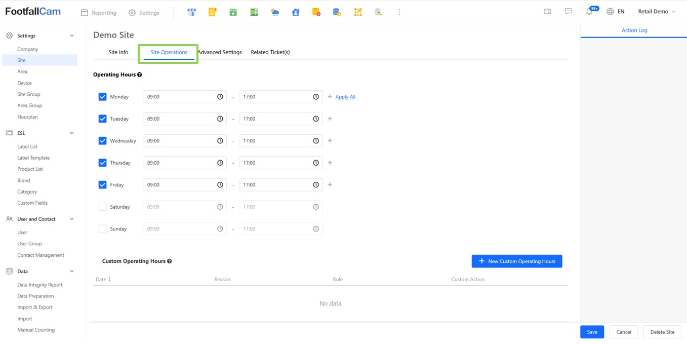 Custom Operating Hours are extraordinary configurations of operating hours for a particular date (range). The configuration must be set up 24 hours before the date (range) applied for the setting to take effect. If the custom operating hours for a site are not set despite the site operating beyond the normal operating hours, any detected activity beyond the normal operating hours will be classified as "abnormal data", affecting the accuracy of future calculations and presentations.
