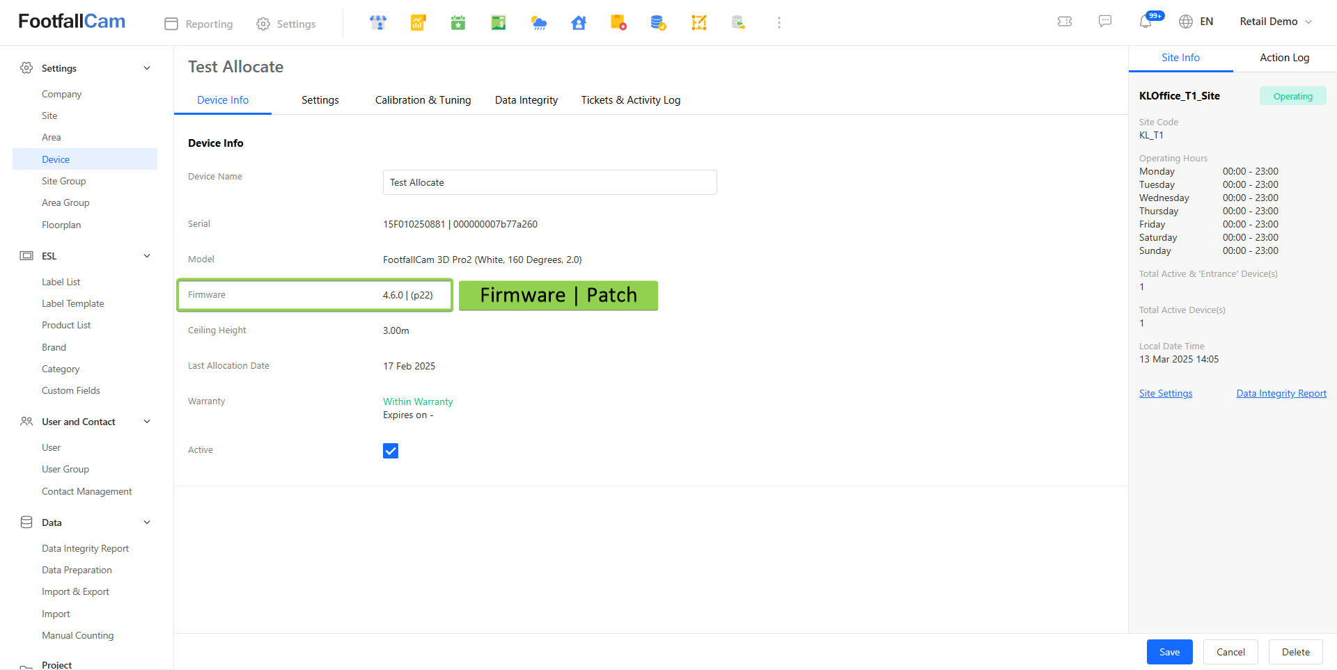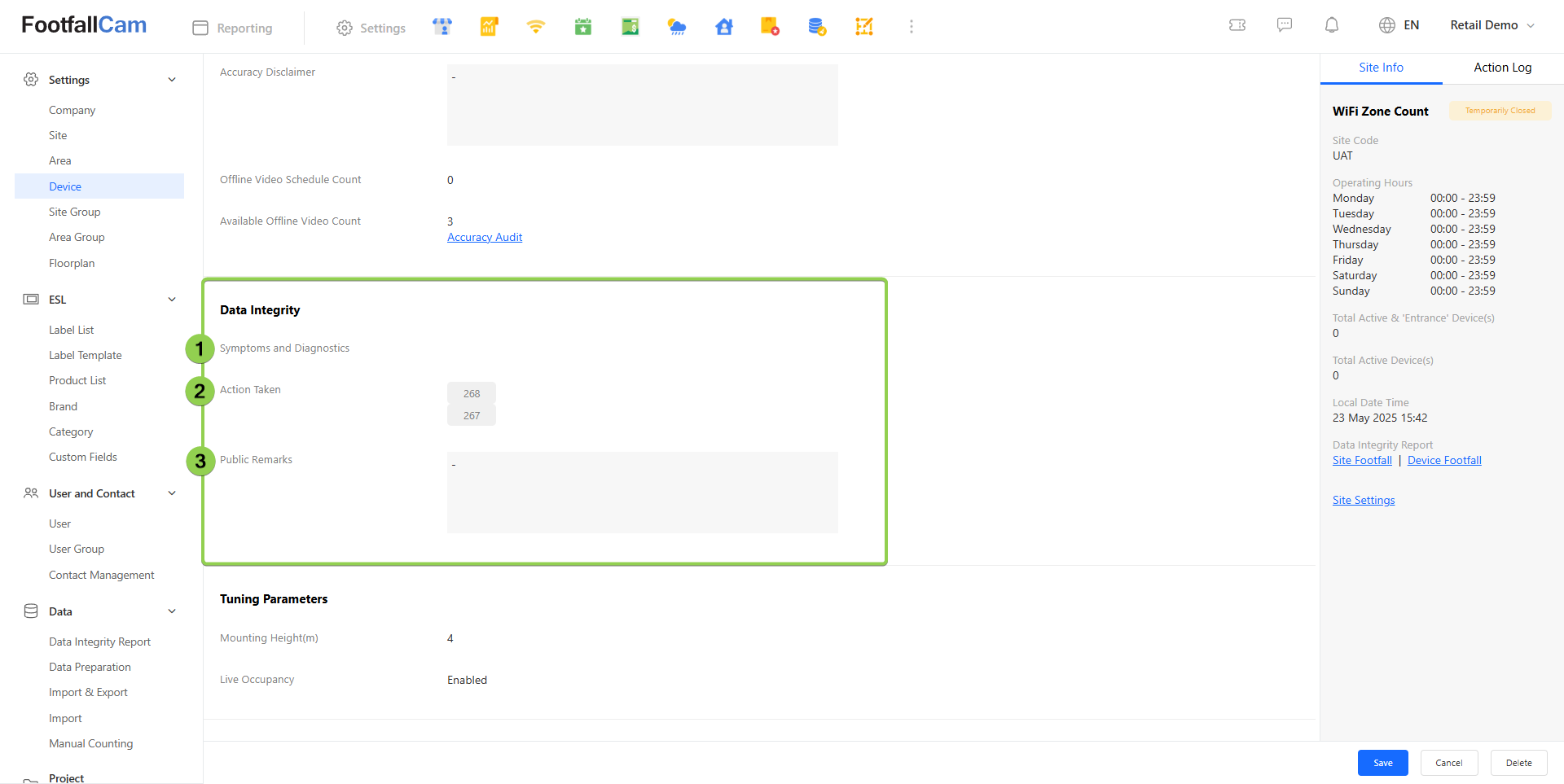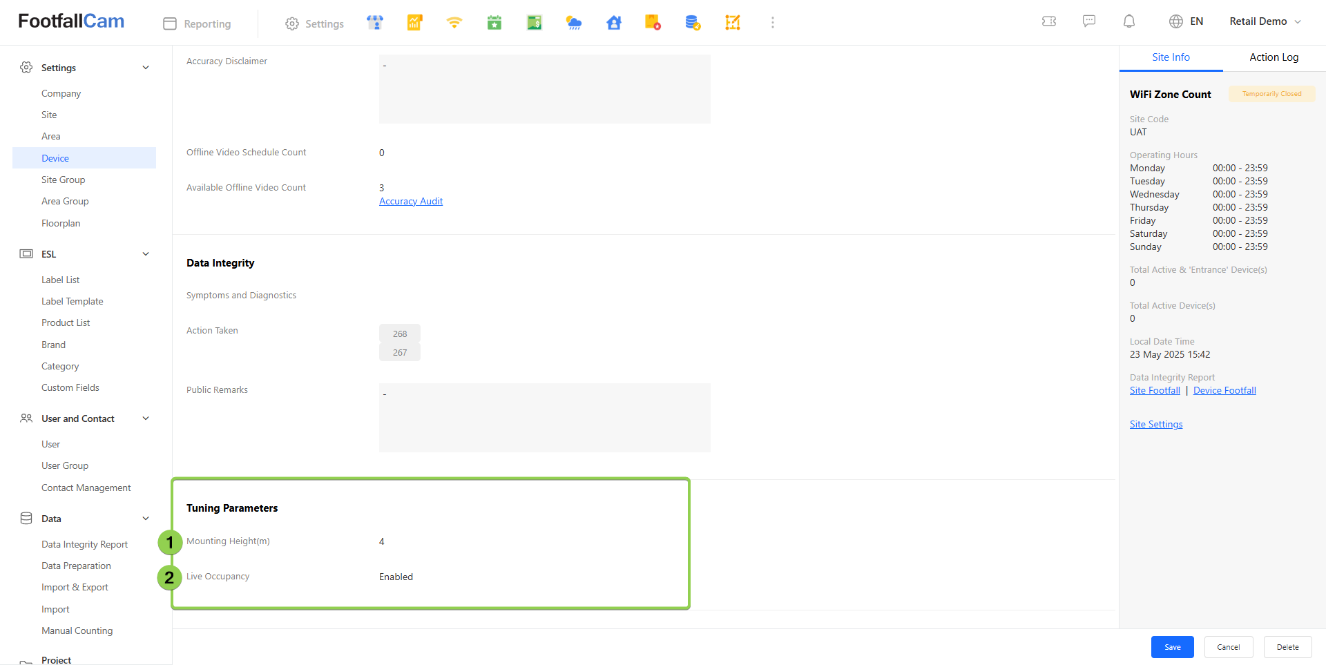 | 1. People Counting | Collect footfall metrics including Footfall In and Footfall Out. |