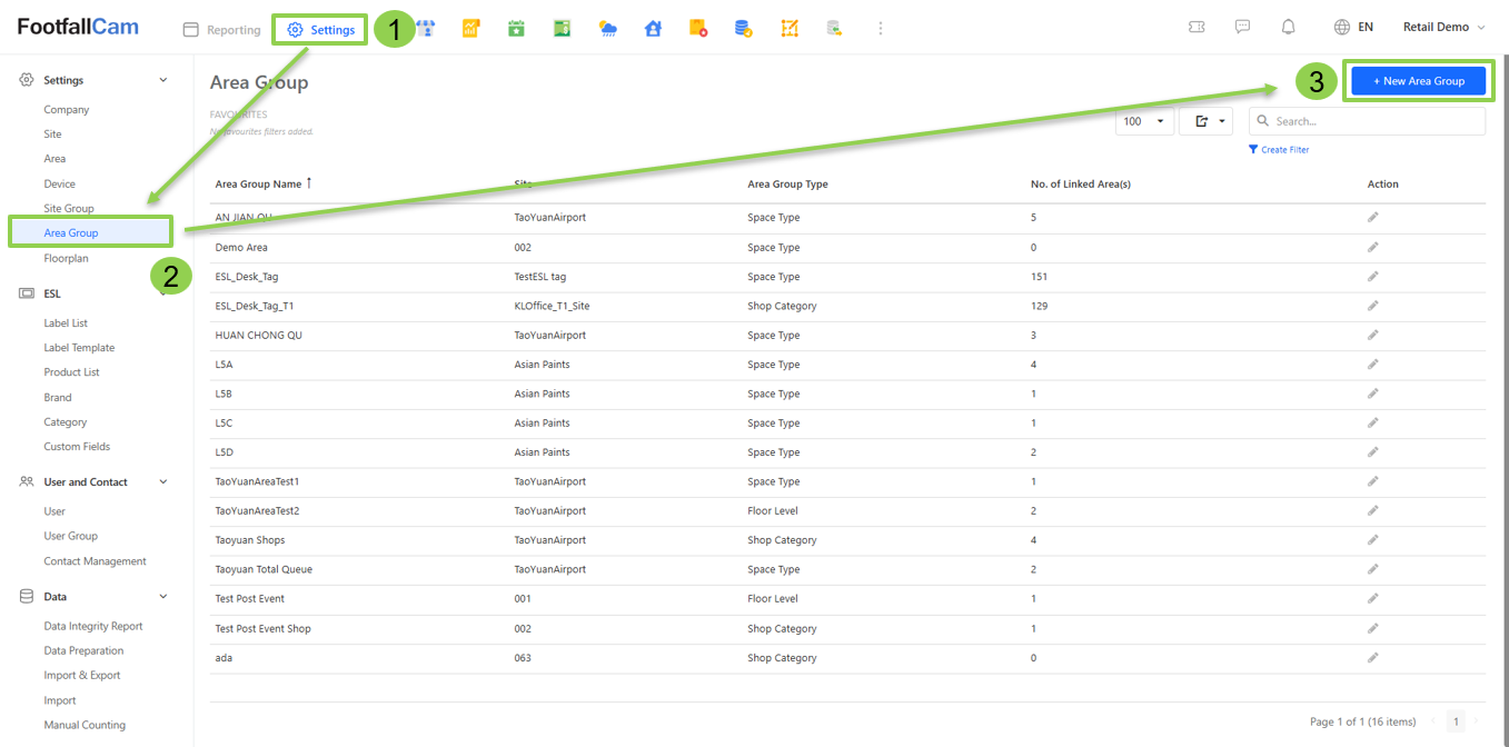 Step 1 - Go to Settings > Area Group to access the area group list.