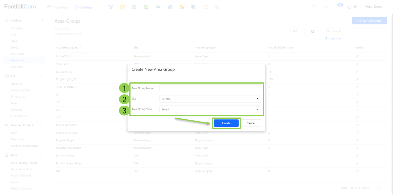 | 1. Area Group Name | Enter your preferred name for the area group. |