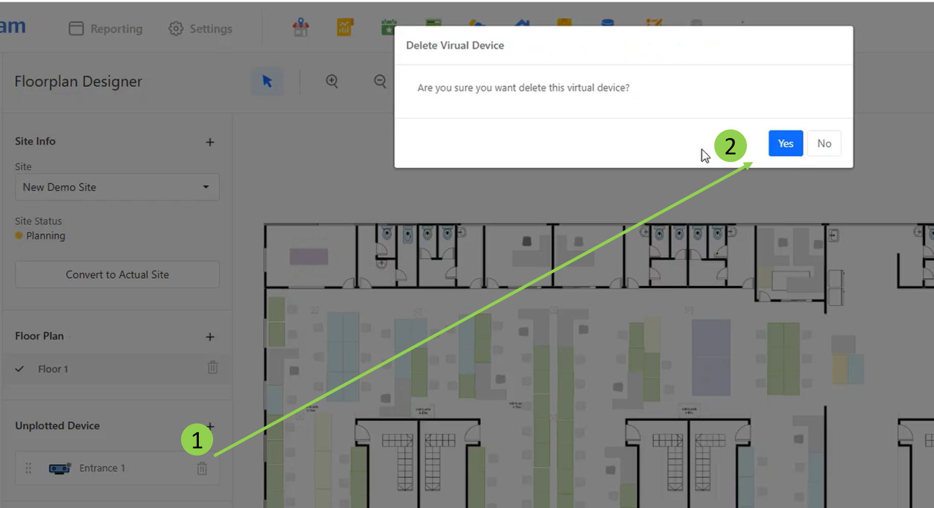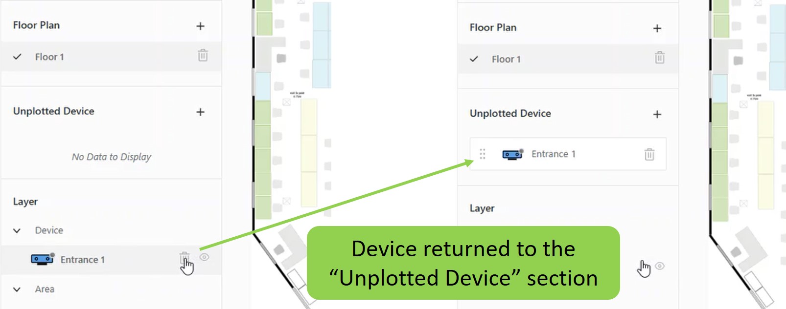 Step 9 - To remove the device from the floor plan, click the "bin" button next to it. This will return the device to the "Unplotted Device" section.