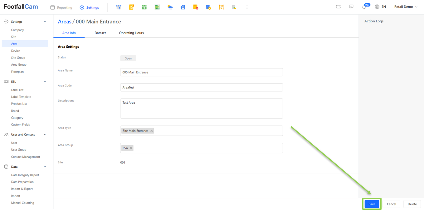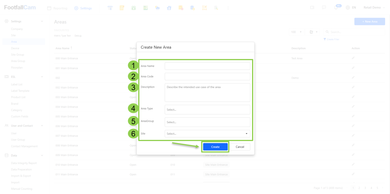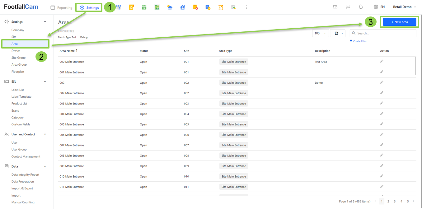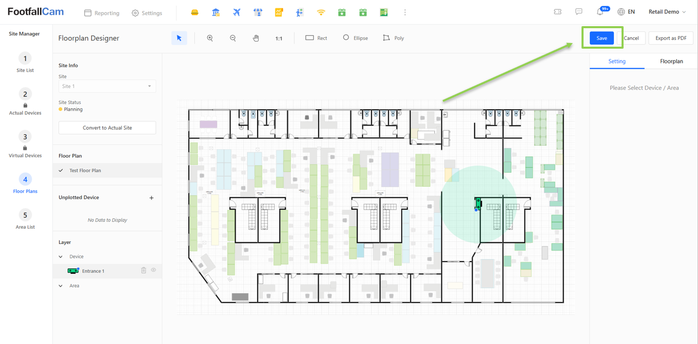 The site entrance area will be created and included the devices with entrance counting enabled automatically when the site is created. This area is mainly for the footfall of the site. If you wish to create more areas, you may follow the steps below: