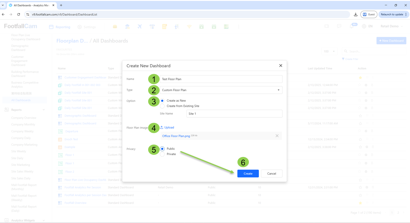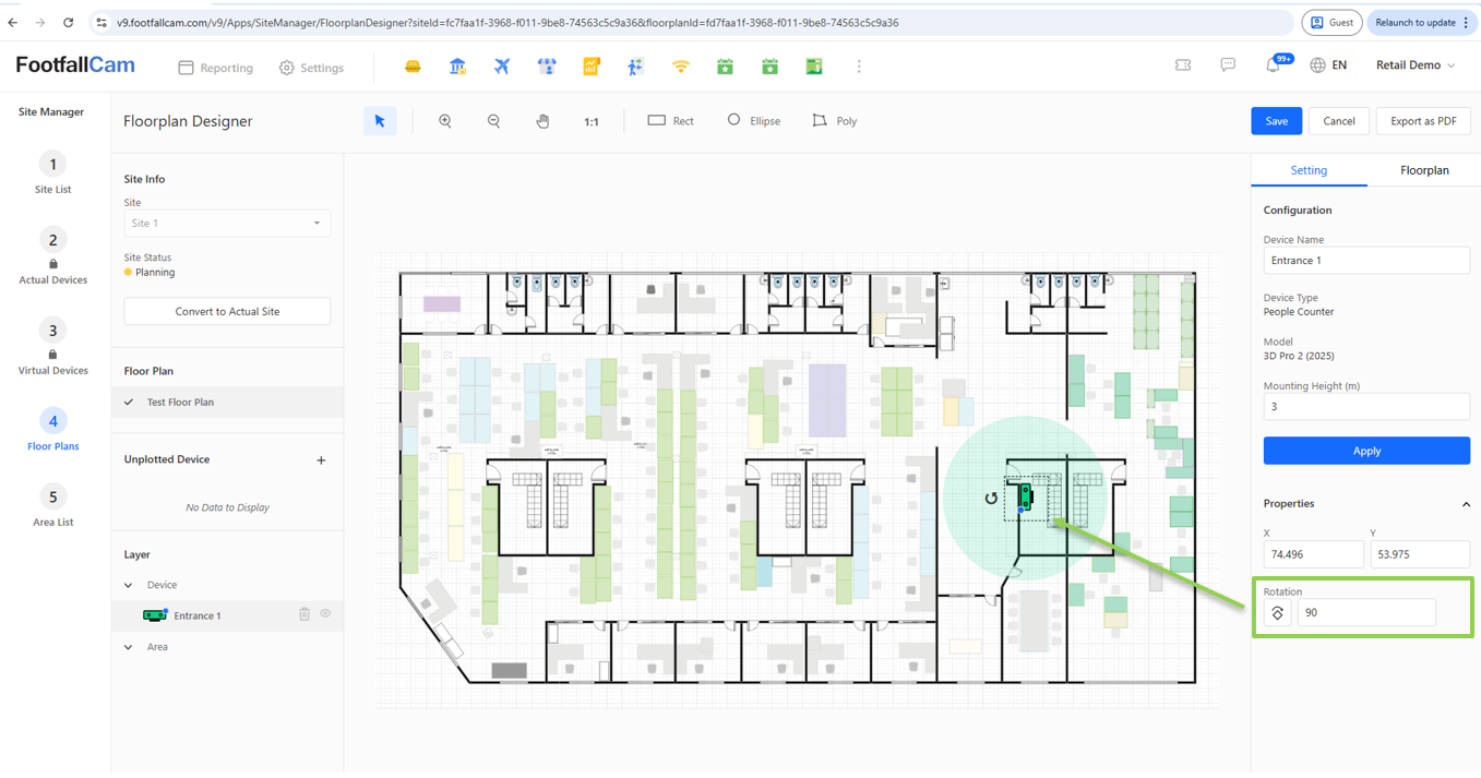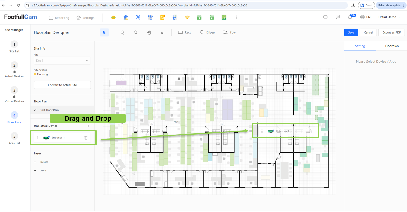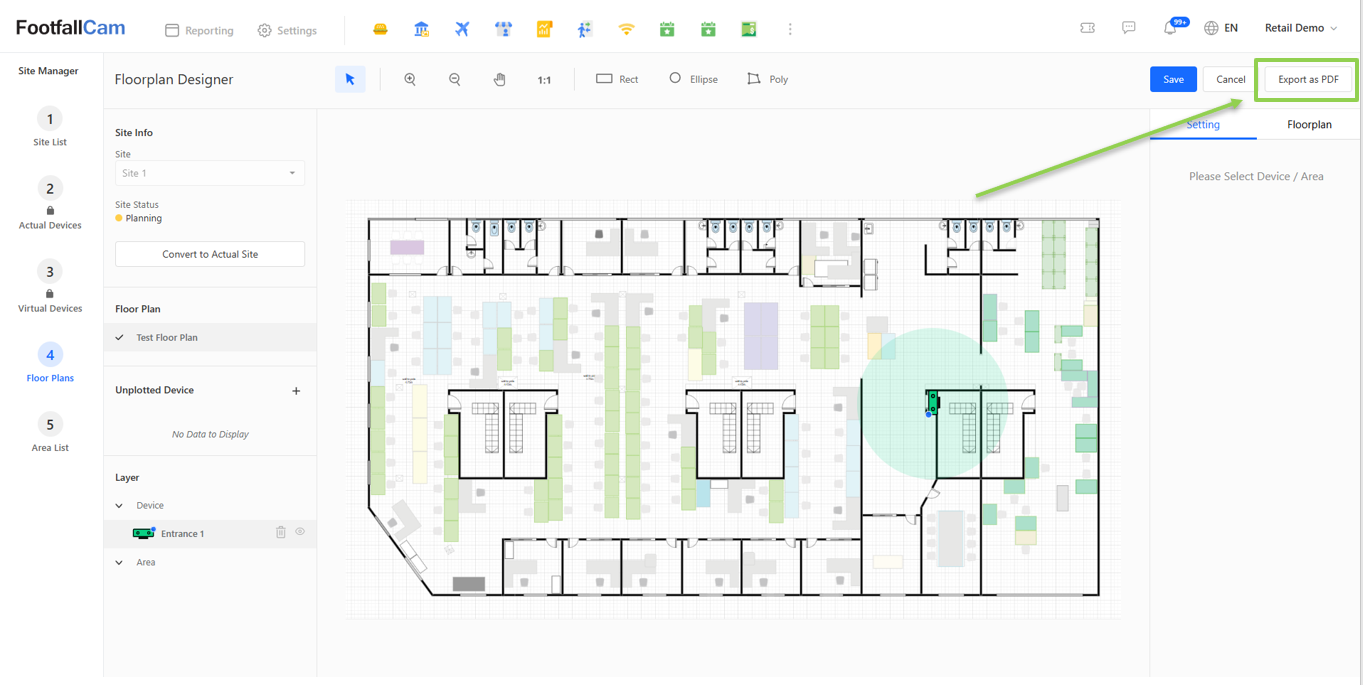 Without a floor plan, users may misjudge the number, type and mounting height of devices needed to cover a region. Without storing the floor plans in FootfallCam V9™, communication between the user and FootfallCam for the creation of a new site or an adjustment to an existing site will be less efficient due to the lack of visualisation.