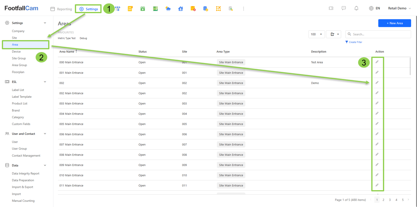 Step 1 - Go to Settings > Area to view the existing area list, click on the pen icon to edit the area details.