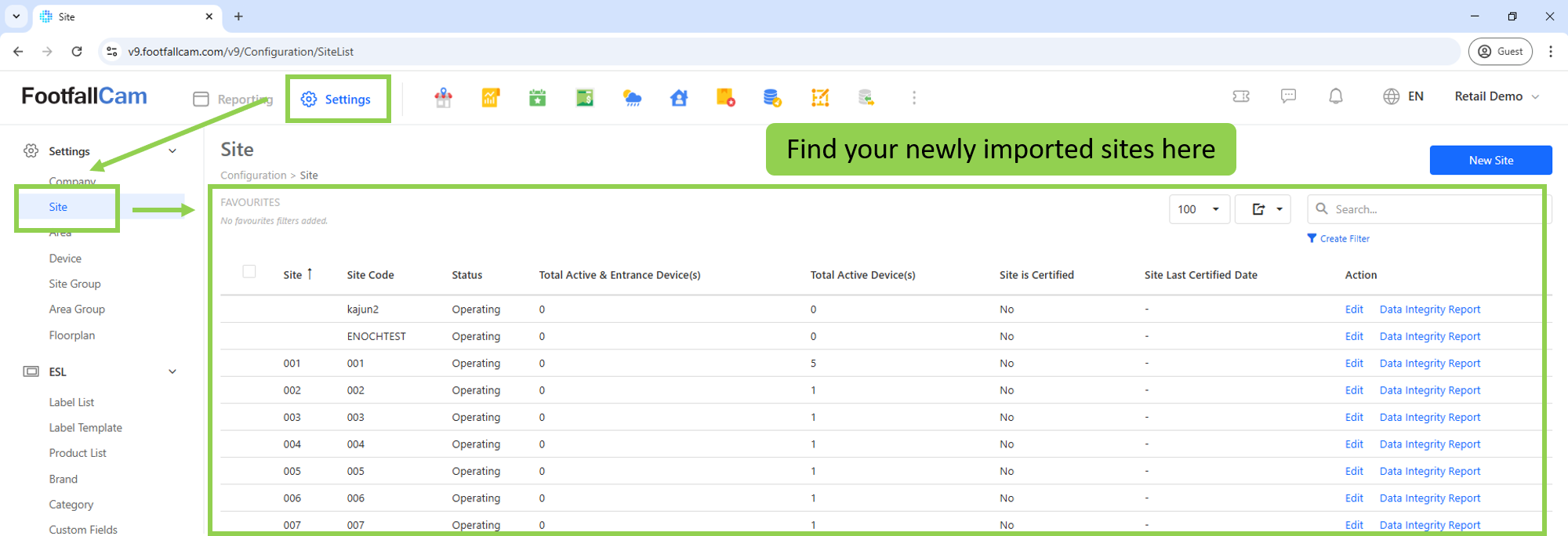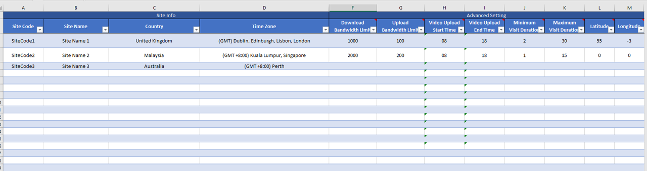 Bulk-creating sites can be made easy by importing a list of sites into FootfallCam V9™. With this feature, a user can efficiently create multiple sites by uploading a spreadsheet with the required information for the sites to be created.