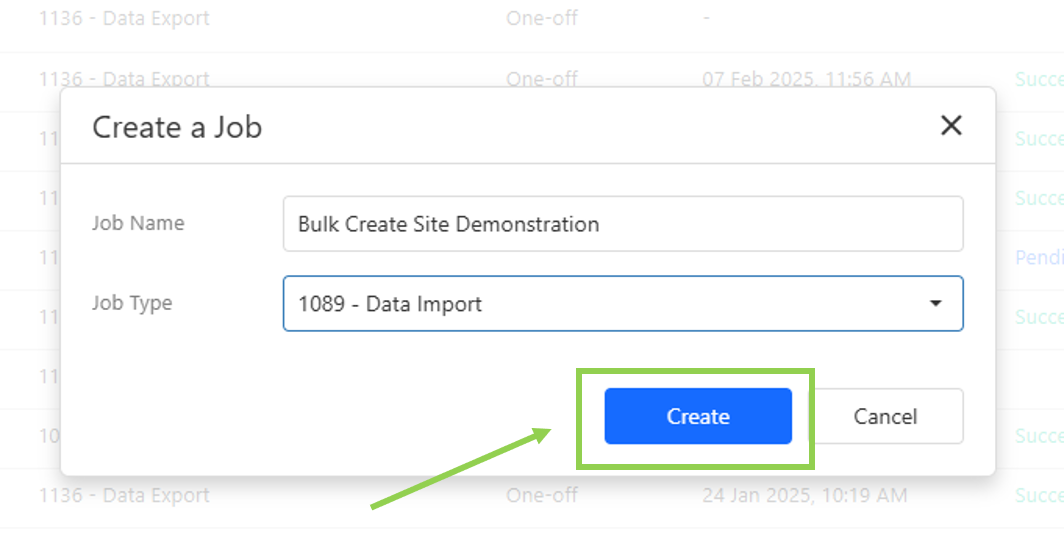 Step 2 - Insert a recognisable name for your job to import the list of sites in the "Job Name" field. For the "Job Type" option, select "1089 - Data Import". Click "Create" to proceed.
