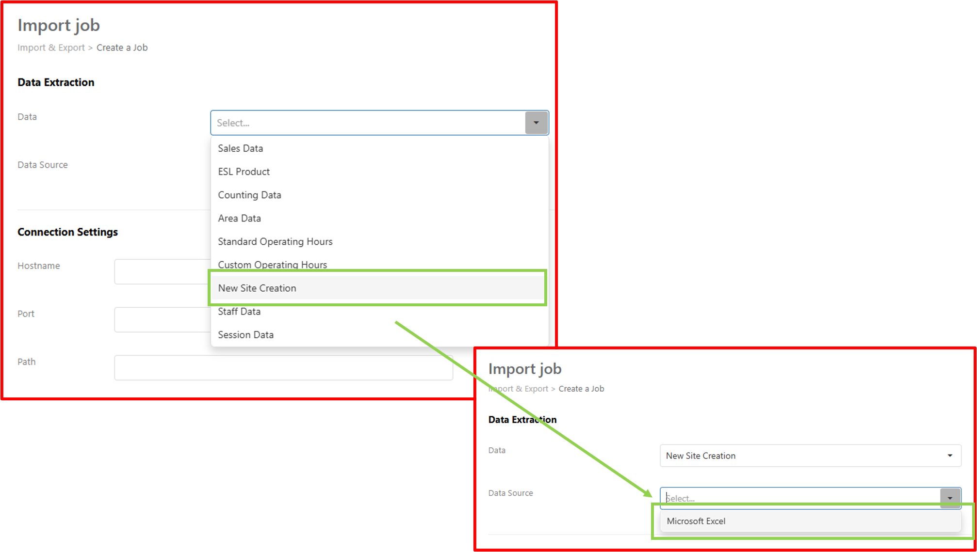 Step 3 - You're now directed to the "Import Job" page. Under the "Data Extraction" section, click on the "Data" field and select "New Site Creation". In the "Data Source" field, select "Microsoft Excel".