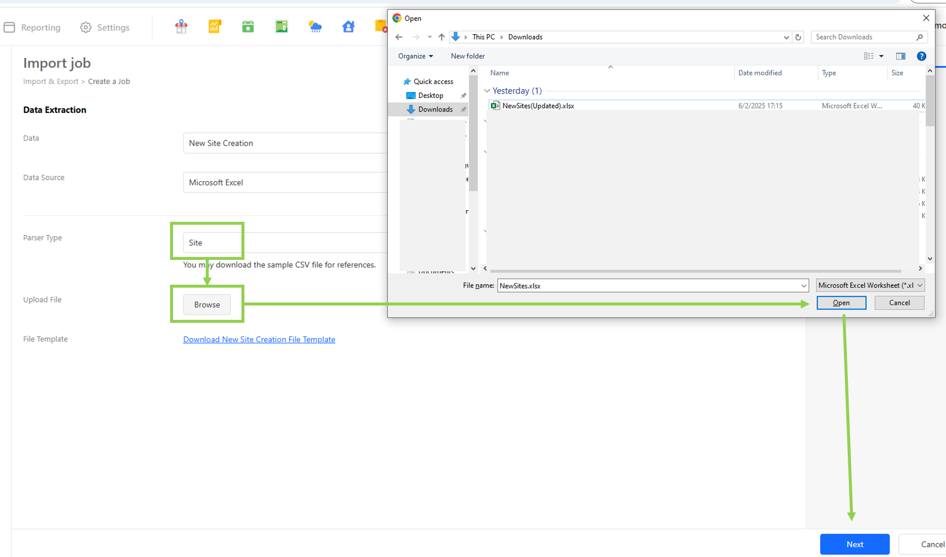 Step 6 - Return to FootfallCam V9™ and select the "Parser Type" as "Site". In the "Upload File" section, click the "Browse" button and upload the edited spreadsheet. After all these have been done, click "Next".