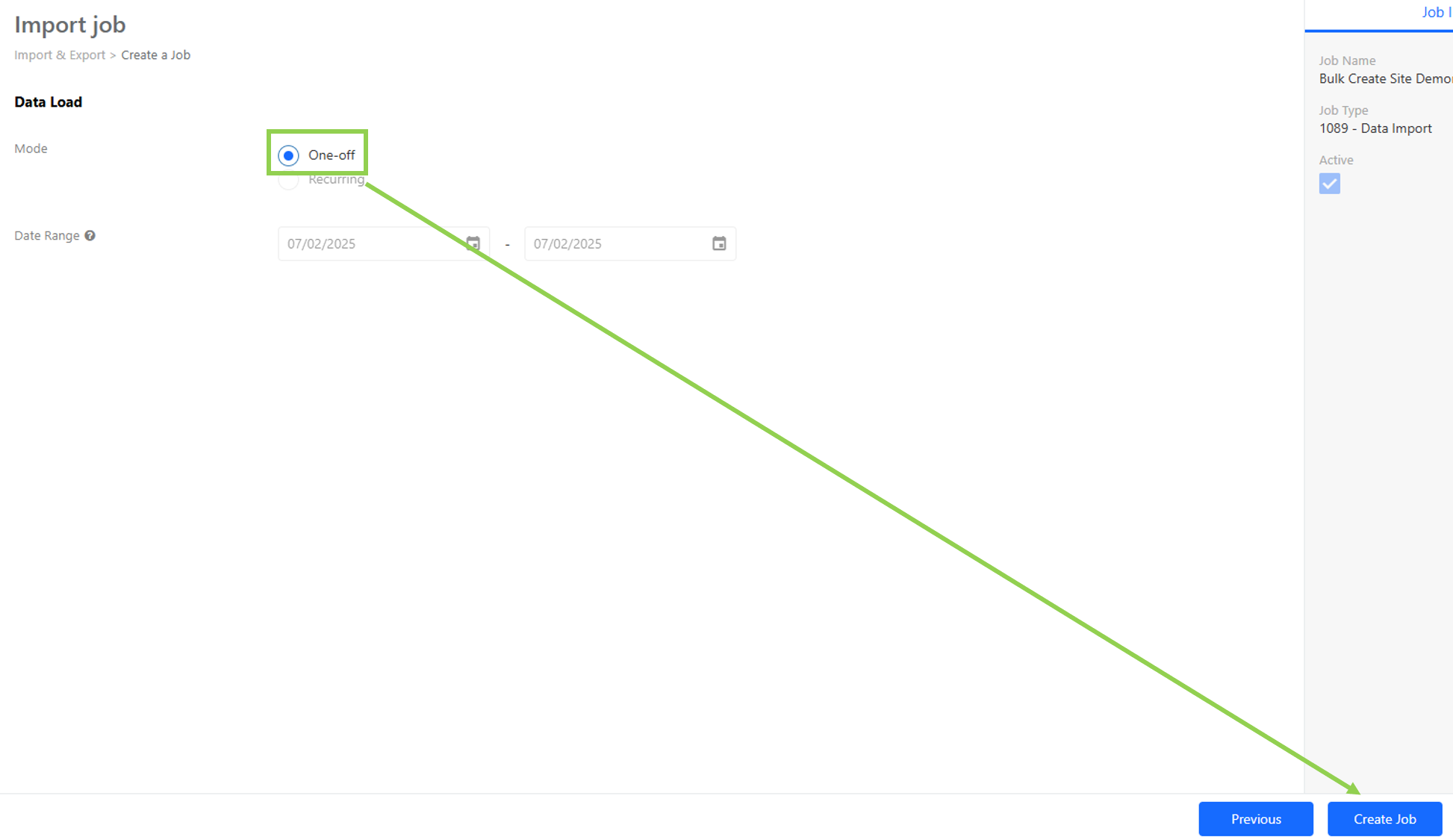 Step 8 - Select "One-off" as the "Mode" and click "Create Job". Only "One-off" is the only option for this type of job. Notice that the "Date Range" has been selected for you as today's date, indicating that the job will begin right away.