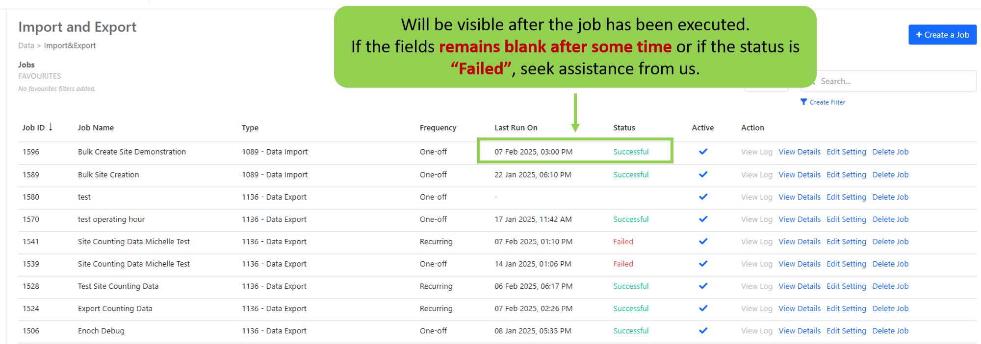 Step 9 - You are now returned to the "Import and Export" list where you may observe the list of jobs. Here, you will see that your job has been created. Observe the "Status" column which indicates the progress of your job. The speed of your job is proportional to the number of sites to be created. If your job hasn't finished in a reasonable amount of time (e.g. 15 minutes), kindly contact "[email protected]".