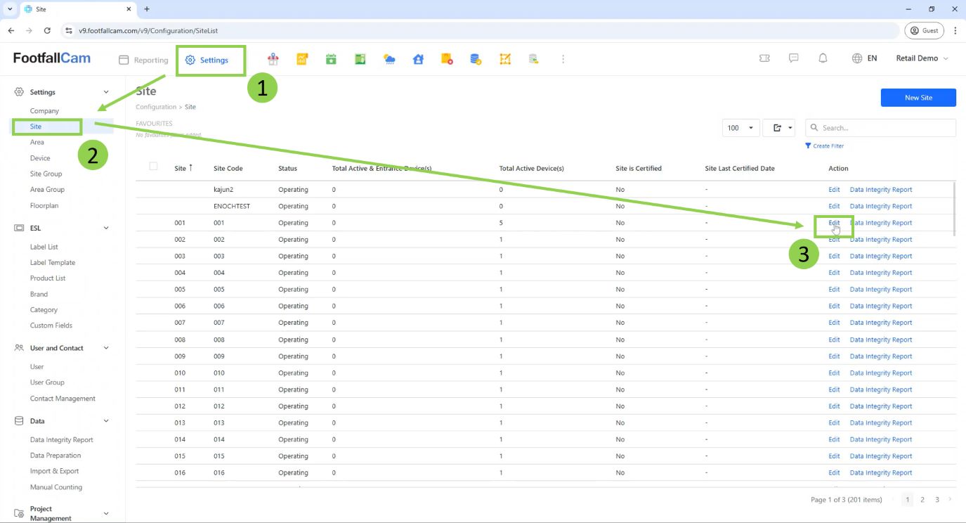 Step 1 - Click on Settings > Site > Edit button in Action column to access the specific Site page.