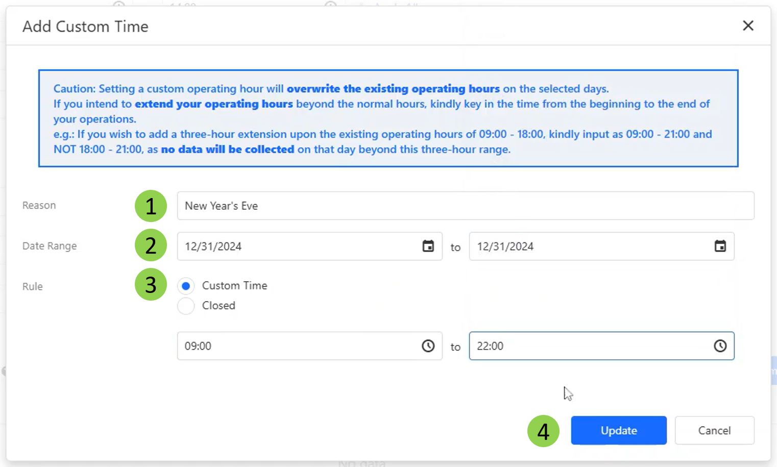 The custom operating hours overwrite and NOT overlap with the existing operating hours. An extension of 2 hours to a site operating from 0900 to 2100 hours should be set as 0900 to 2300 hours and NOT 2100 to 2300 hours. The latter setting will be interpreted as the site operating only between 2100 and 2300 hours and will cause discrepancies in the site's data.