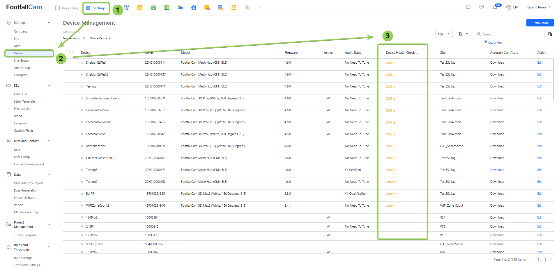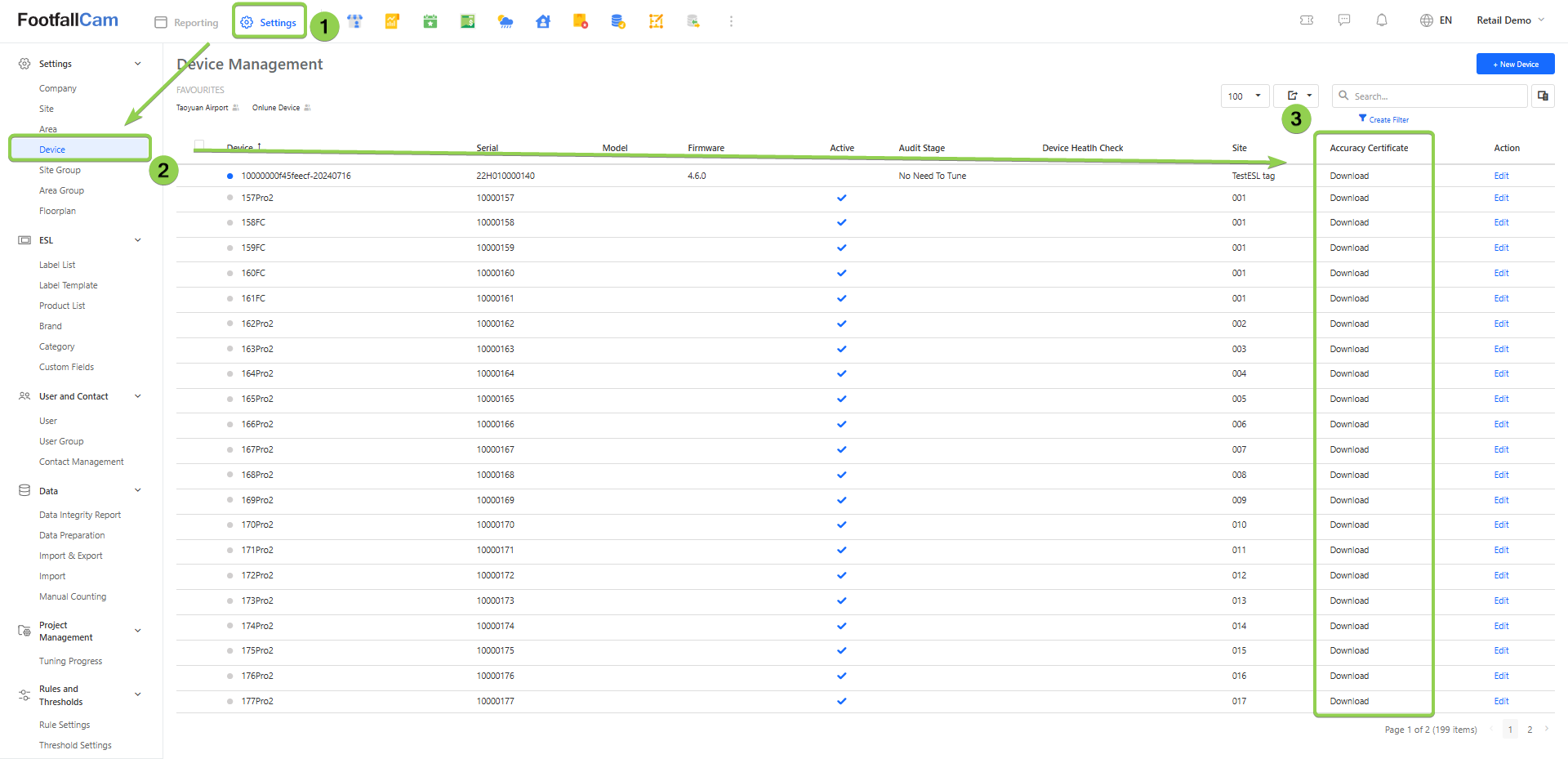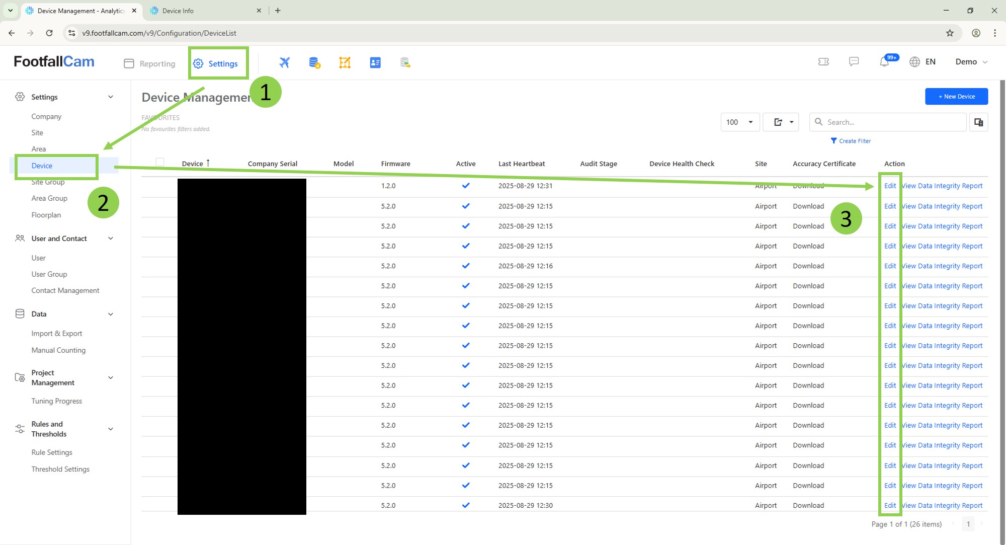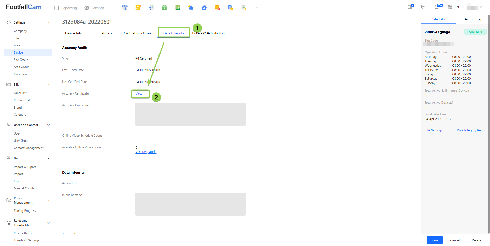 | Pre-Requisites | 1. Check the Device(s) status to ensure it is active, enabled with the 'Footfall Counting' and 'Site Entrance' counting usage and is currently Online 2. Check the device accuracy audit stage to ensure it is tuned or certified * Repeat Step 1 and 2 for all the device(s) of the site which is intended to collect site level footfall data |