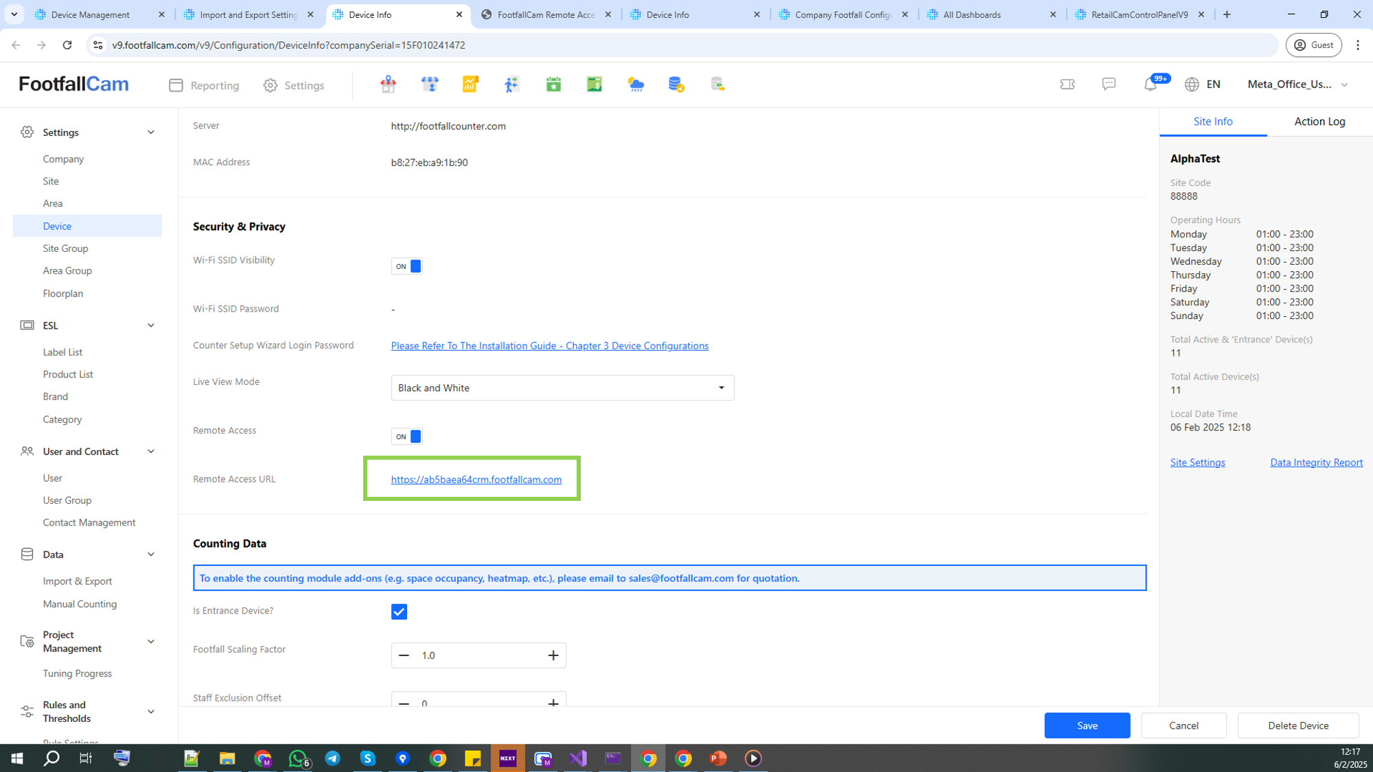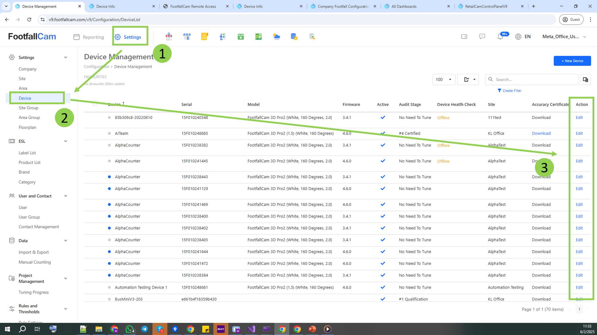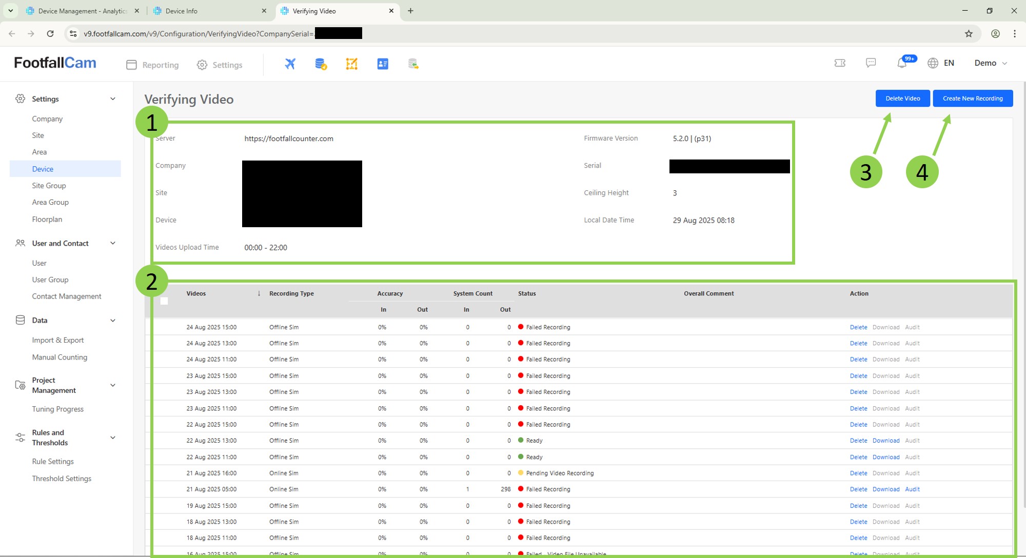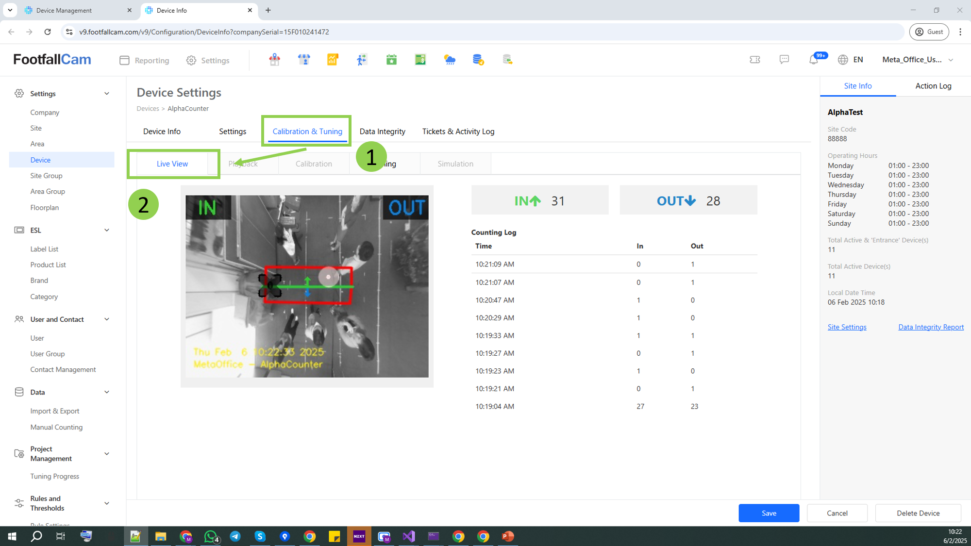 | Pre-Requisites | 1. Check the Device(s) status to ensure it is active, enabled with the 'Footfall Counting' and 'Site Entrance' counting usage and is currently Online 2. Check the device accuracy audit stage to ensure it is tuned or certified * Repeat Step 1 and 2 for all the device(s) of the site which is intended to collect site level footfall data |