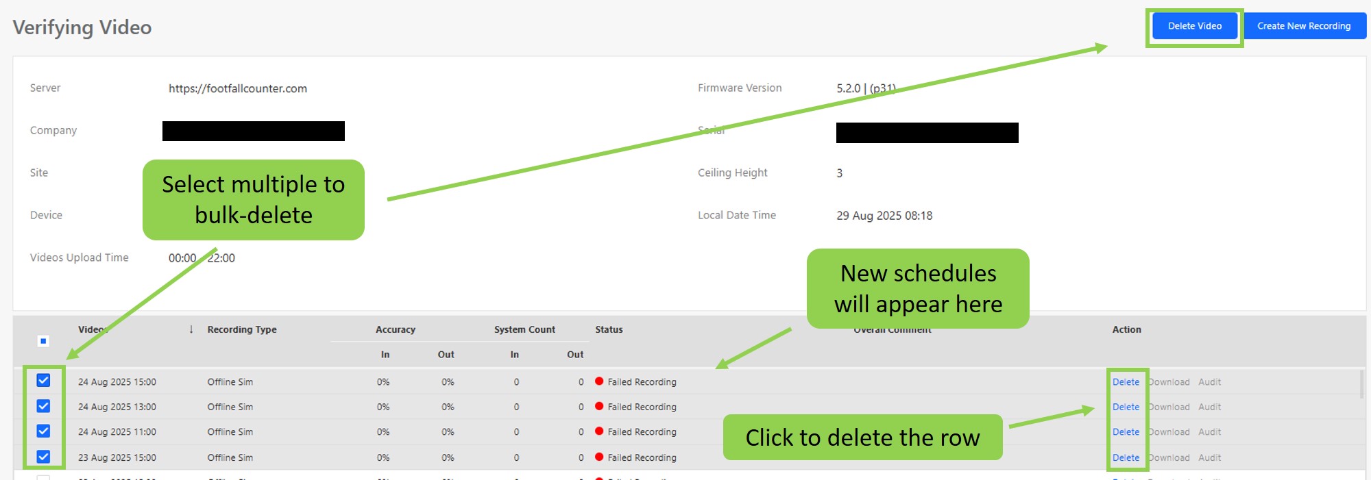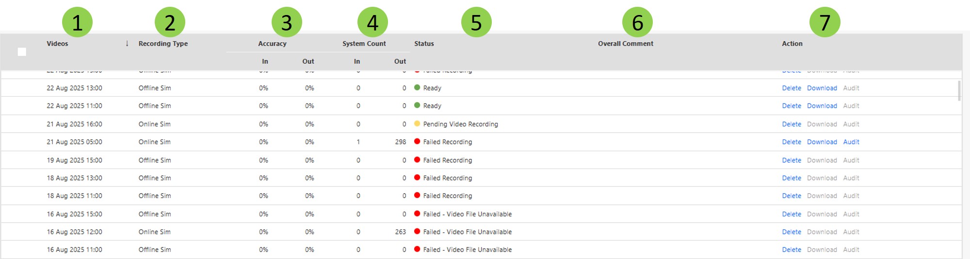 | 1 | Serial, Site: Details of the device. Scheduled Time: The local time at which the video was scheduled. Duration: The original duration of the recording. The produced recording may be shorter than the original duration due to fluctuating framerate throughout the recording. |