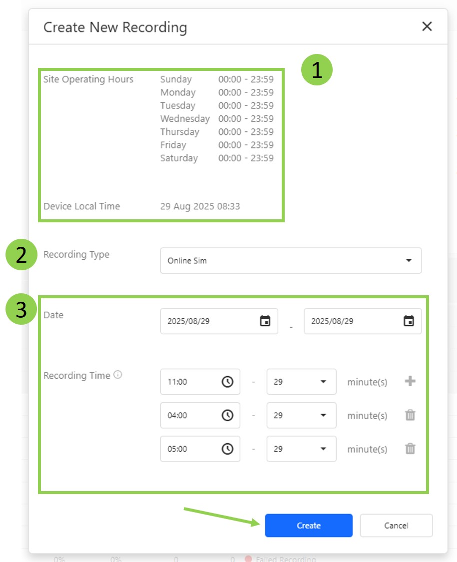 | 3 | Select the Date and Recording Time of the recording. The user can schedule videos to be recorded at multiple times across multiple days. For example, if the user schedules between 14 August 2025 to 16 August 2025 at three times: 11:00, 13:00 and 18:00, three schedules per day will be produced, totalling 9 schedules. The three initial recording times are provided by the system. These are the periods when traffic is expected to be the highest, and the user can schedule during these hours for a greater chance of getting a large sample size of footfall. If the user wishes to add or subtract any recording times, they can do so by clicking the "➕" or "🗑️" buttons. |