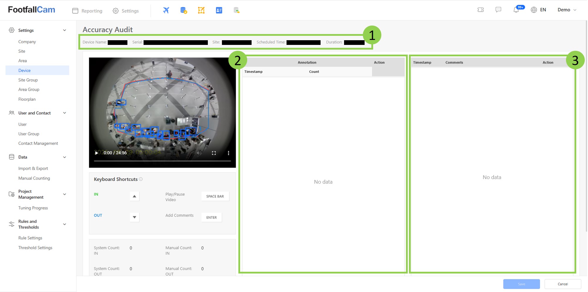 | Pre-Requisites | 1. Check the Device(s) status to ensure it is active, enabled with the 'Footfall Counting' and 'Site Entrance' counting usage and is currently Online (Note: 'Site Entrance' counting usage is only required if the data collected from this device is to be aggregated to the site level data) 2. Check the device accuracy audit stage to ensure it is tuned or certified (Note: Device is not ready for accuracy audit if it is not tuned or certified) |