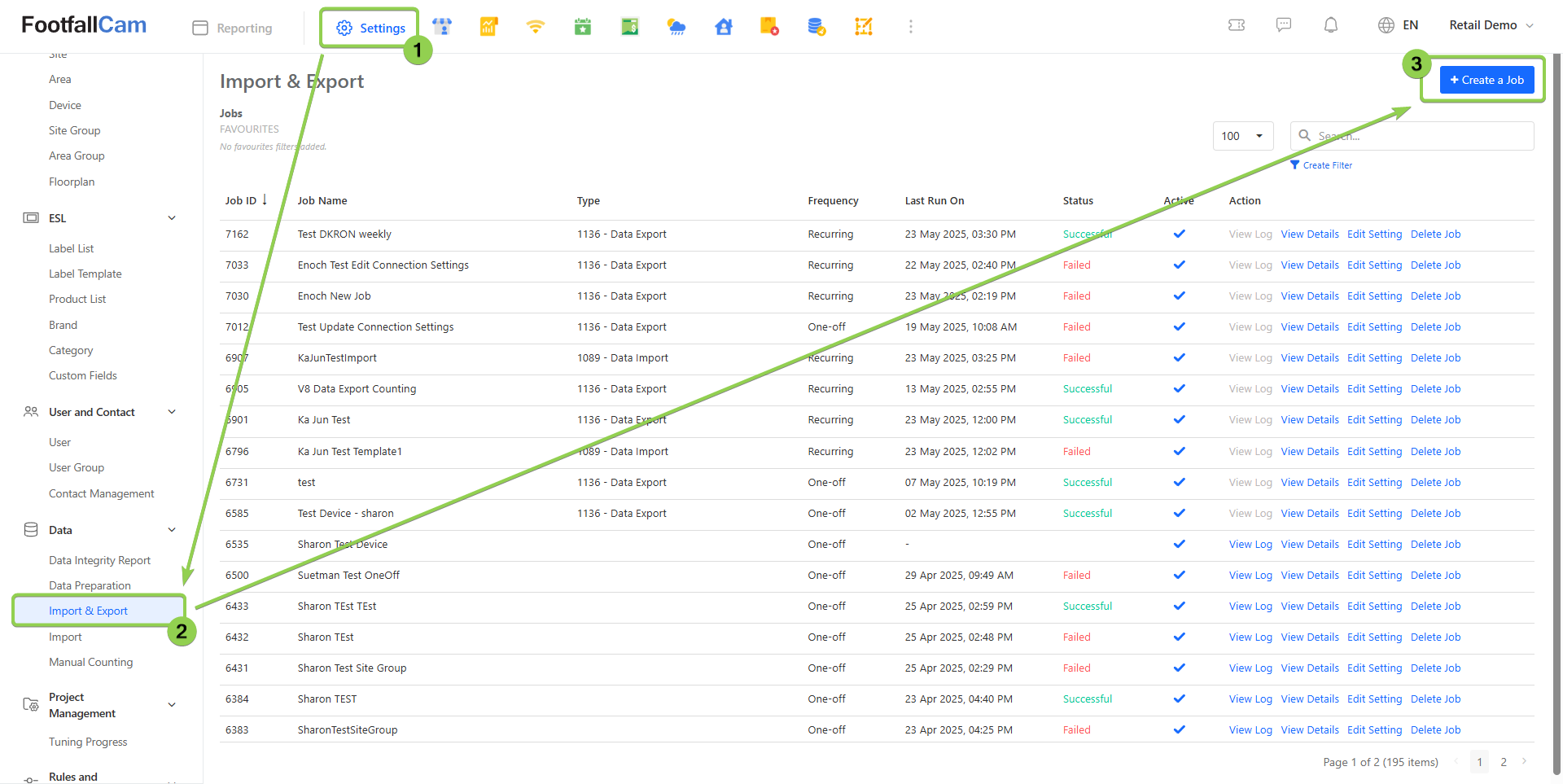 Step 2 - Go to Settings > Data > Import & Export to access the existing import & export job list.