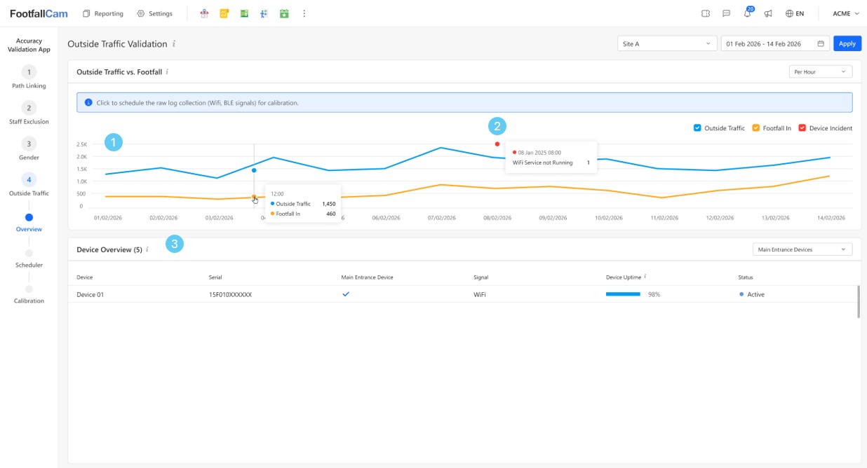 | 1 | This graph shows the 14-day Outside Traffic data trend comparing to the Bluetooth Outside Traffic and Footfall In. Note: You may click on any day in the graph to schedule Wi-Fi or BLE raw log capture for both historical or future date time for calibration. |