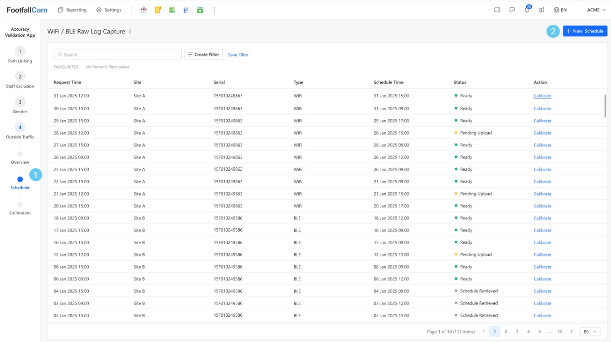 Click “New Schedule” to schedule Wi-Fi or BLE raw log capture for both historical or future date time for calibration.