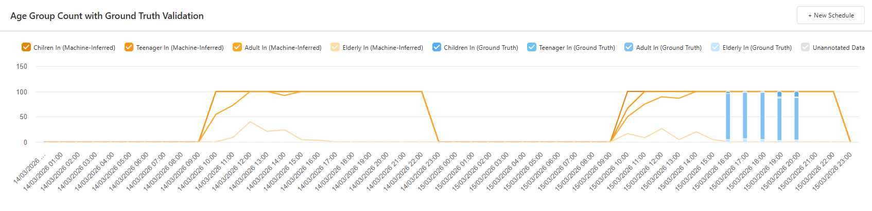 The process of the Validation Workspace enables users to compare our current machine predictions with ground truth annotations collected from scheduled image campaigns, and users can review differences and determine whether the model is accurately predicting the age category of each person. The workspace mainly visualises the data through the overview graph that compares both machine inferred and ground truth annotation.