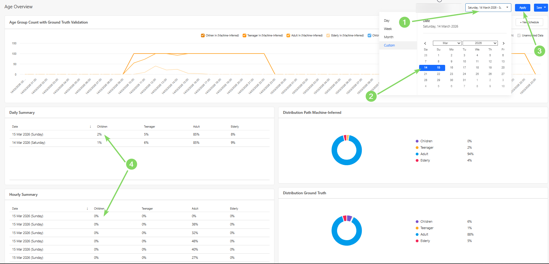 Users can use the Overview Section to obtain an overall high-level summary of the number of each age category being predicted when people enter the store. This page also provides a visual comparison between machine-inferred predictions and ground truth annotations, allowing users to quickly evaluate model performance and identify discrepancies.