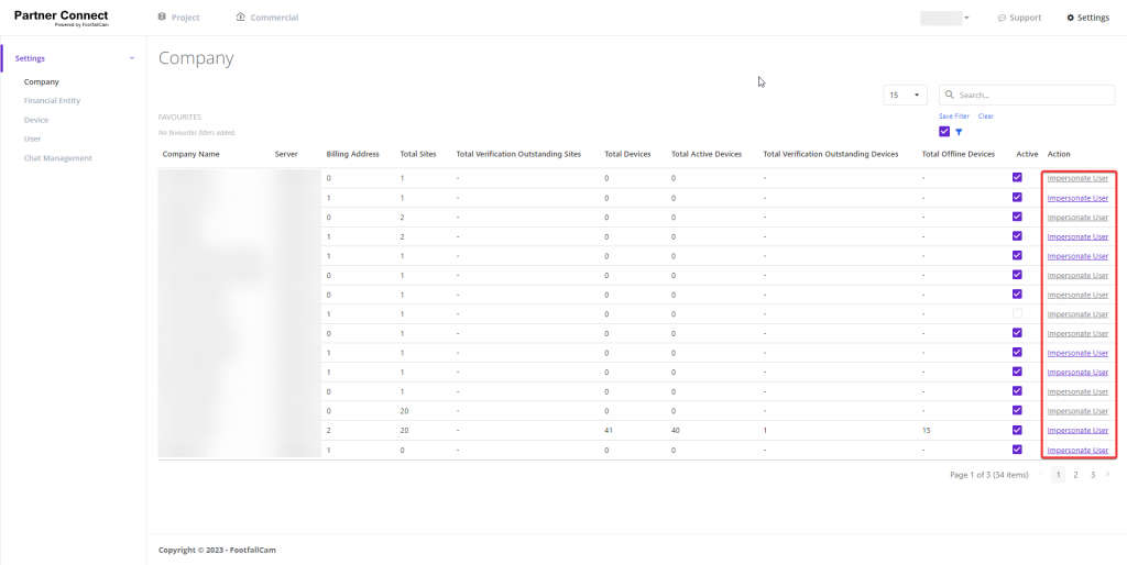 Select the desired company for impersonation, then click on the associated purple link