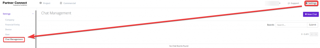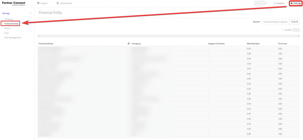 The Settings section includes Company, Financial Entity, Device, User and Chat management.