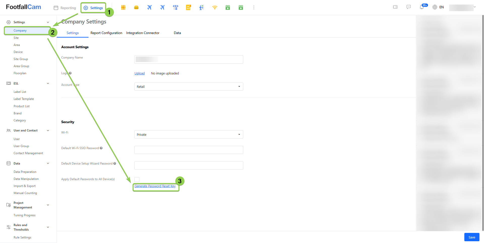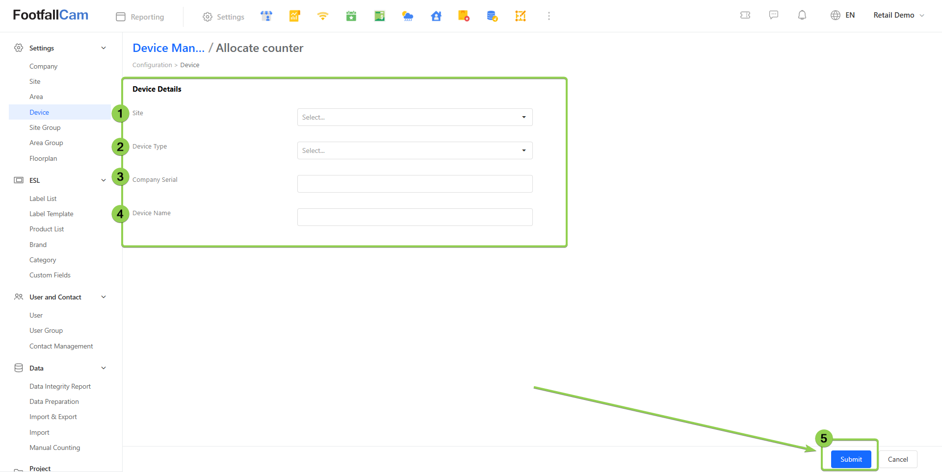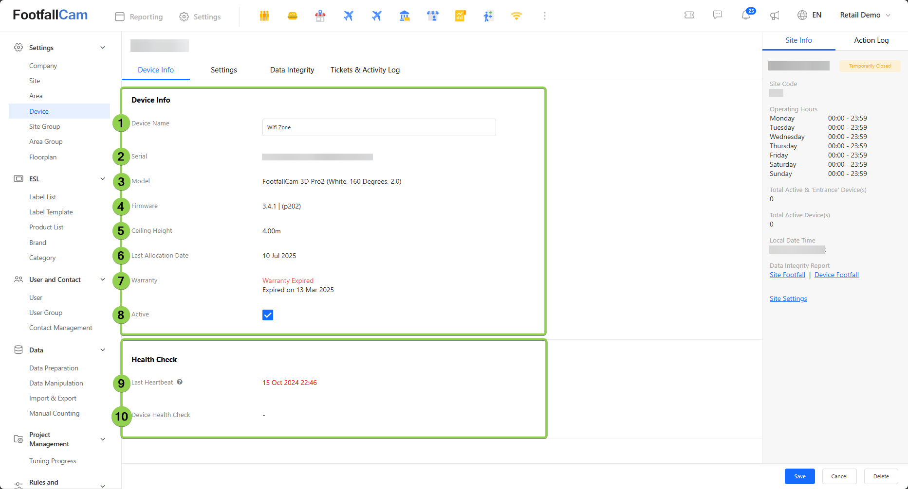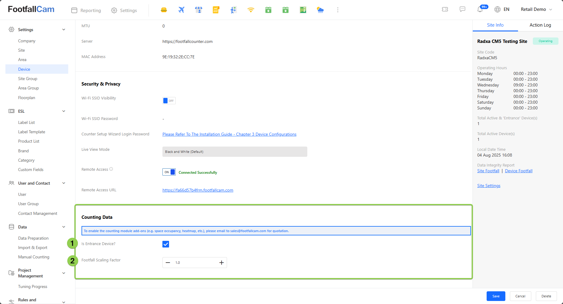 | 2. Site Name | Enter a preferred site name. (Info: Site name inserted will be applied to features in FootfallCam Analytic Manager V9™.) |