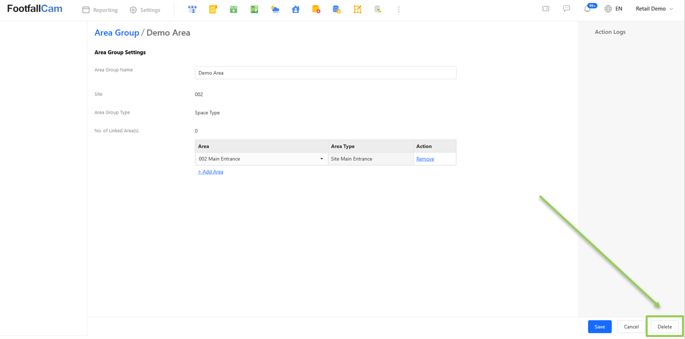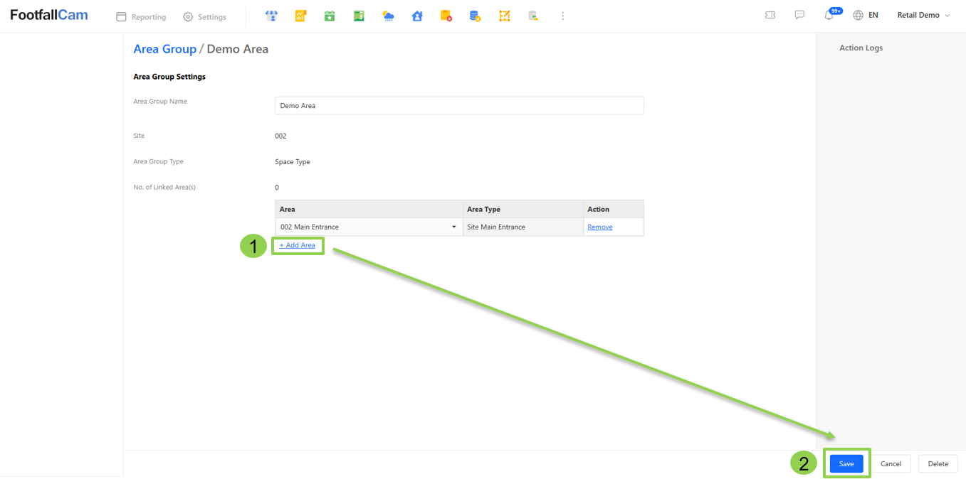 The site entrance area will be created and included the devices with entrance counting enabled automatically when the site is created. This area is mainly for the footfall of the site. If you wish to create more areas, you may follow the steps below: