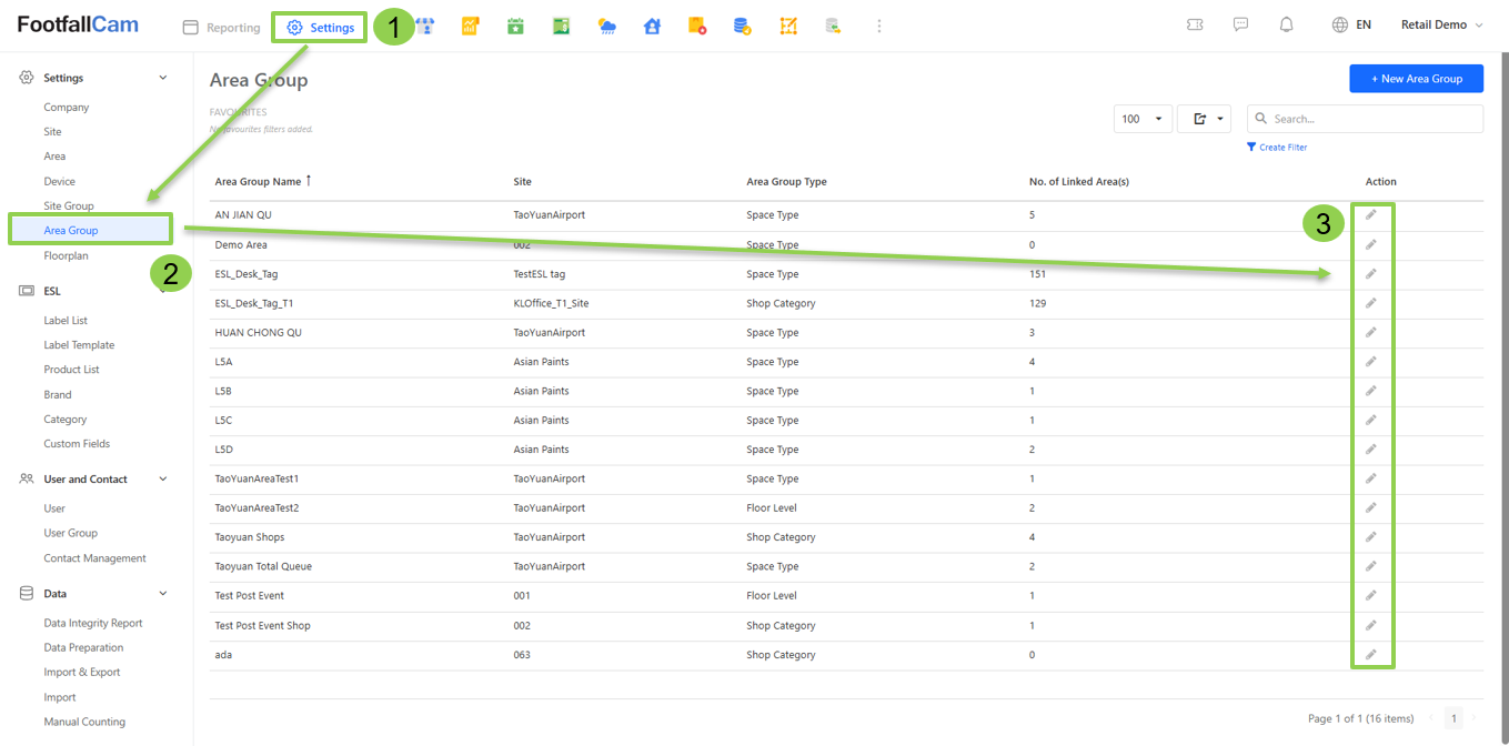Step 1 - Go to Settings > Area Group to view the existing area group list, click on the pen icon to edit the area group details.