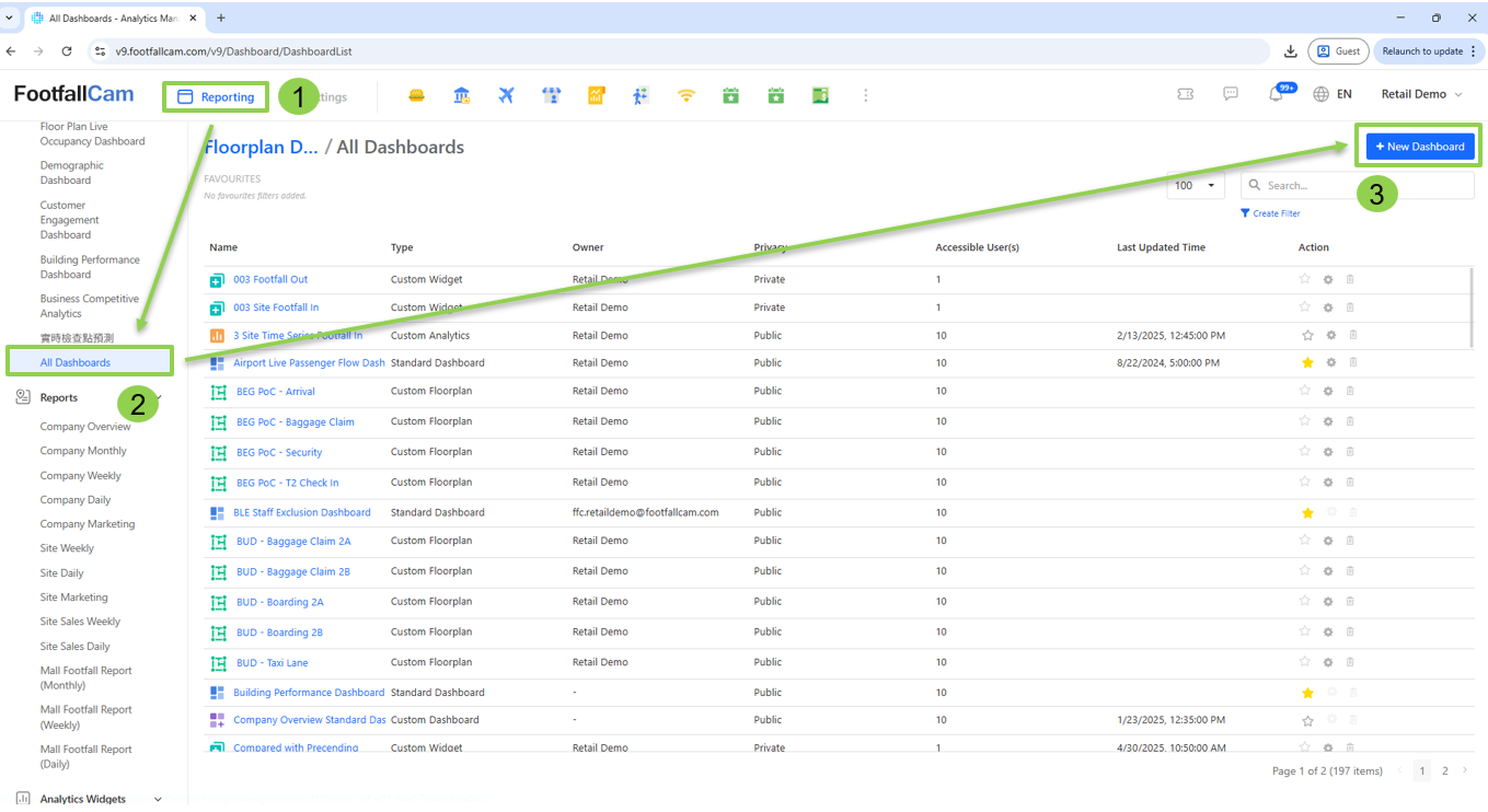 Step 1 - Go to Reporting > All Dashboards and click on "+ New Dashboard" button.