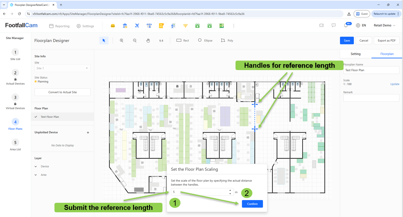 Step 3 - Set a reference length with any two points on the floor plan. Insert the actual distance (in meters) between these two points and click "Confirm".
