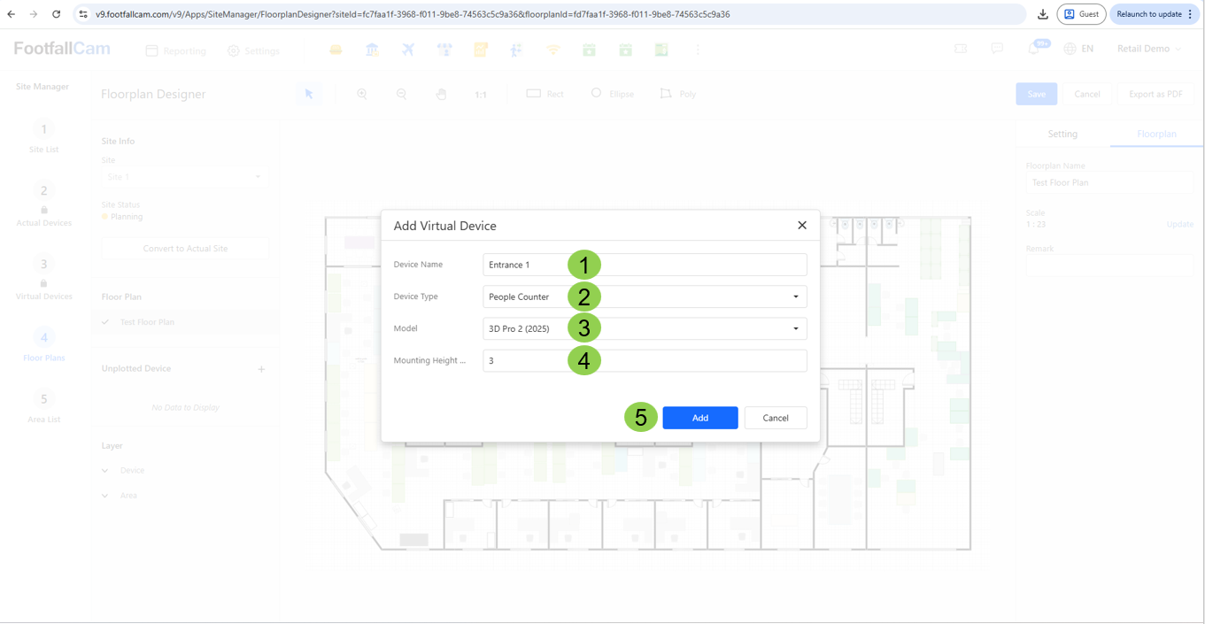 Without a floor plan, users may misjudge the number, type and mounting height of devices needed to cover a region. Without storing the floor plans in FootfallCam V9™, communication between the user and FootfallCam for the creation of a new site or an adjustment to an existing site will be less efficient due to the lack of visualisation.