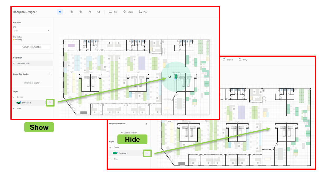 Step 6 - In the "Layer" section, your added device will be shown under the "Device" list. Drag your device to place it onto the floor plan.