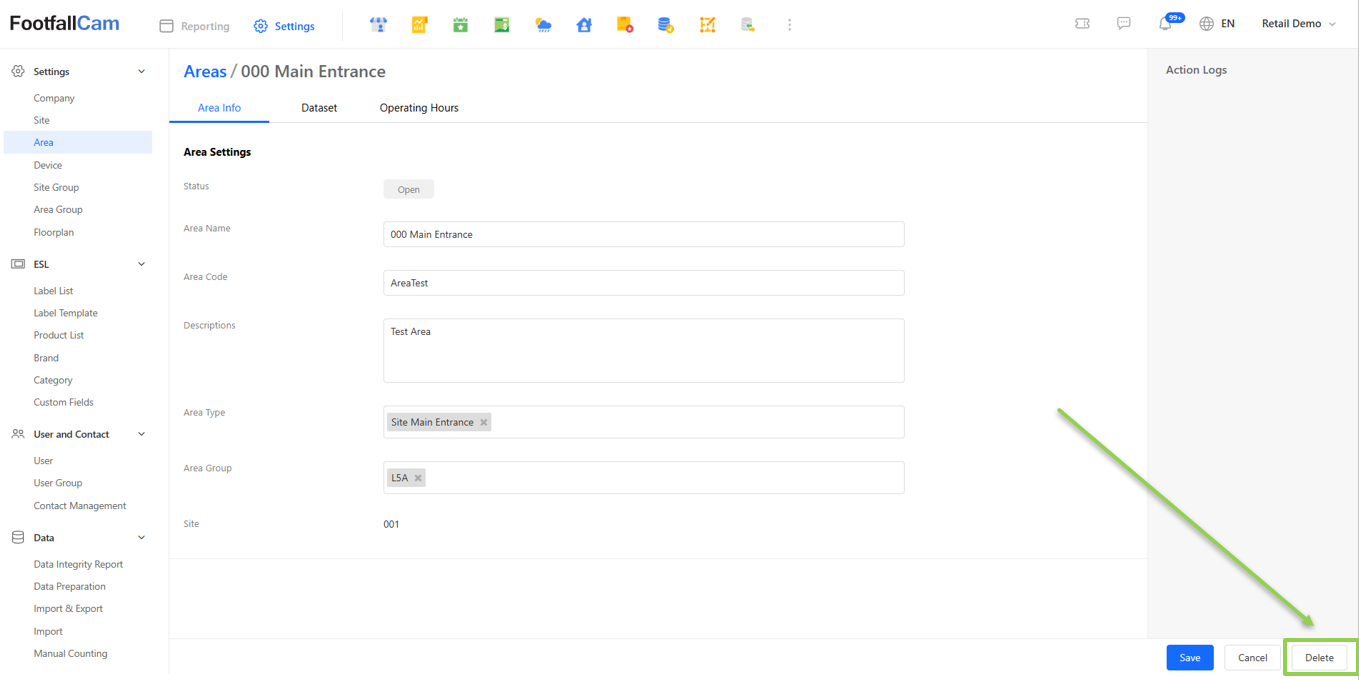 Step 2 - Click on the "Delete Area" button to remove the area and its data from the server.