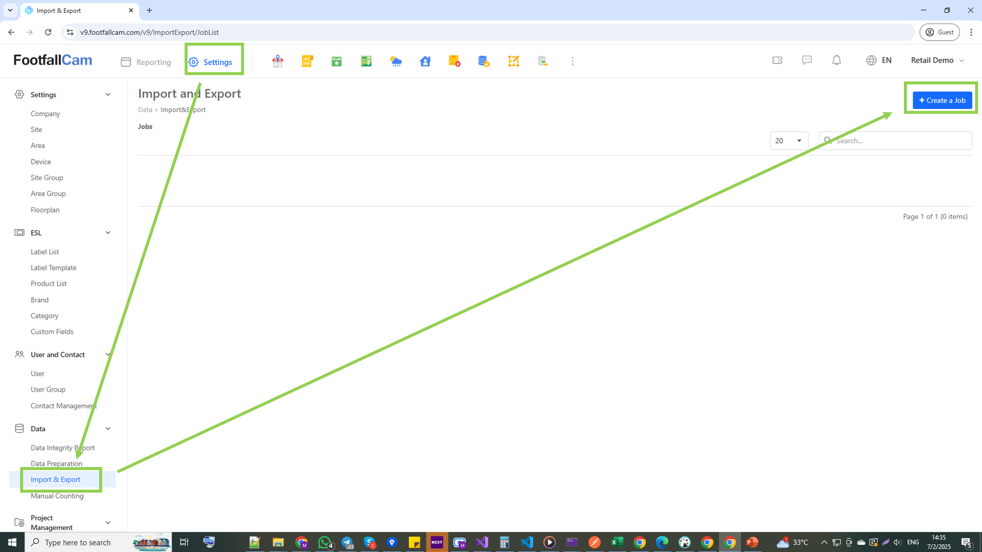 Step 1 - Click "Settings" in the top navigation bar. Then, under "Data" in the left navigation bar, click "Import & Export". After that, click the "Create a Job" button.