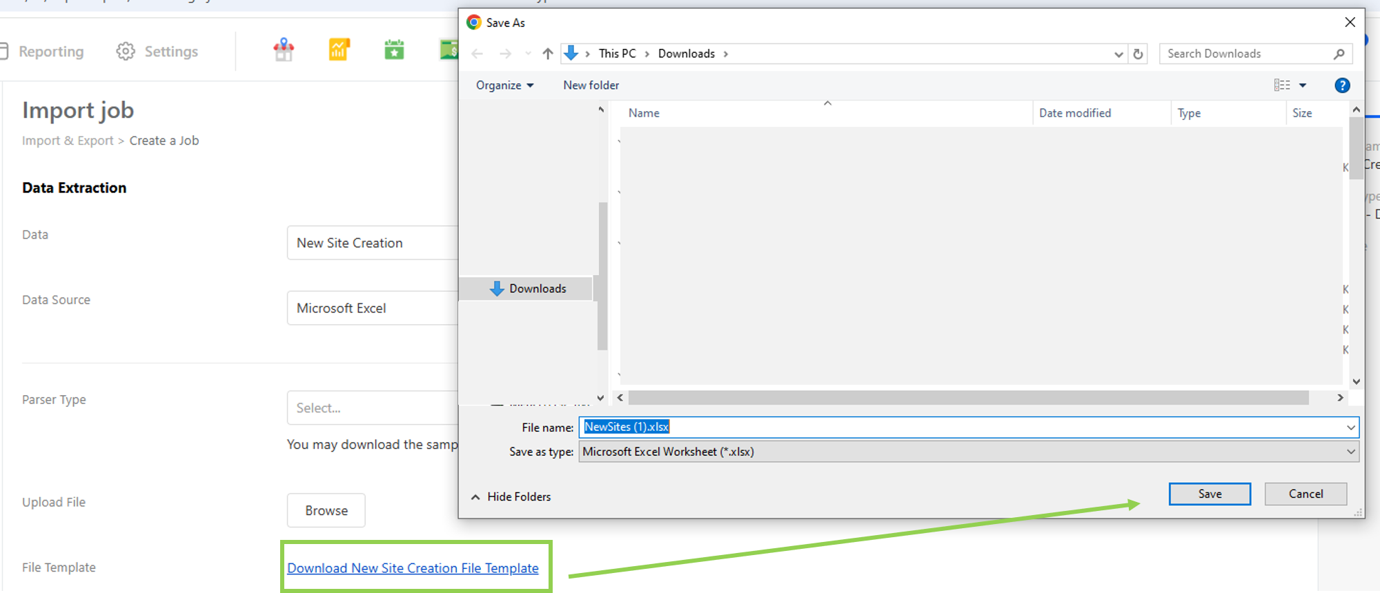 Step 3 - You're now directed to the "Import Job" page. Under the "Data Extraction" section, click on the "Data" field and select "New Site Creation". In the "Data Source" field, select "Microsoft Excel".