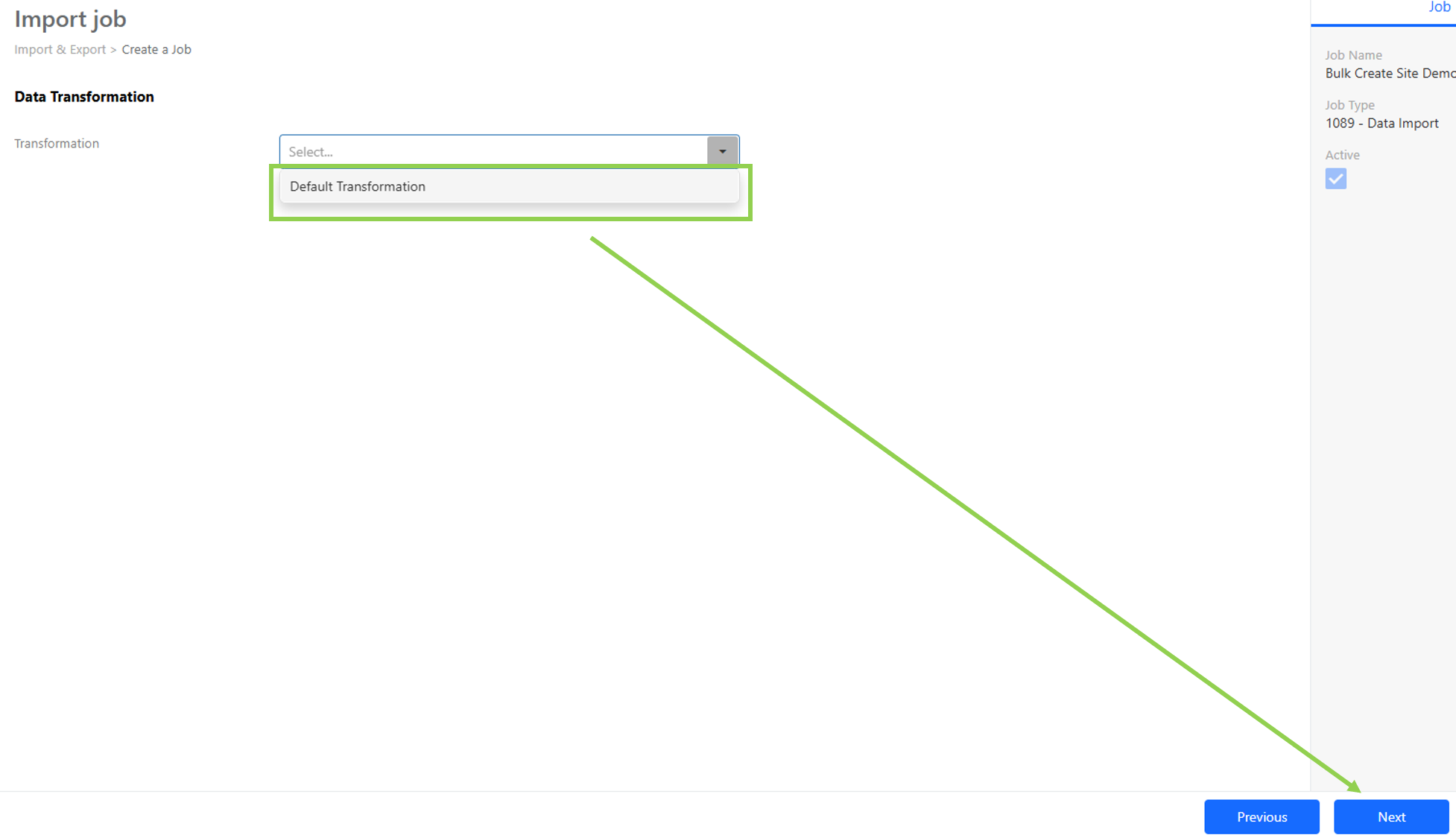 Step 2 - Insert a recognisable name for your job to import the list of sites in the "Job Name" field. For the "Job Type" option, select "1089 - Data Import". Click "Create" to proceed.