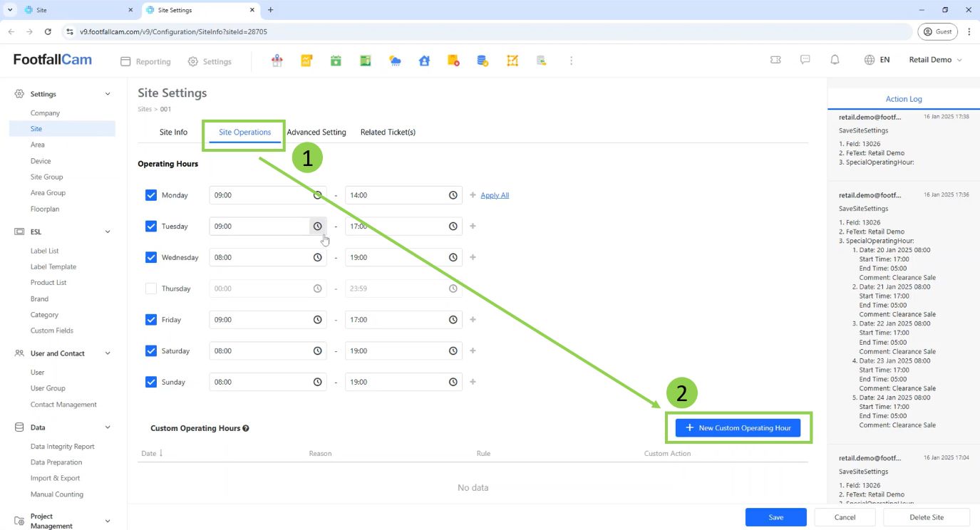 Step 2 - In the "Site Settings" page, click the "Site Operations" tab. Then, click the "New Custom Operating Hour" button.