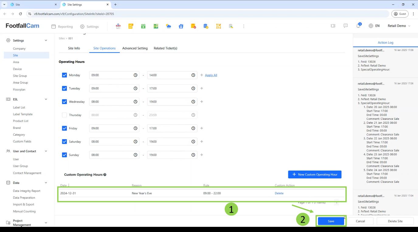 A site operates from 0900 hours to 2100 hours on a normal day. The user wishes to extend the operating hours to 2300 hours on Christmas Eve and thus set the custom operating hours for this site on 24/12/2025 to 0900 - 2300 hours.